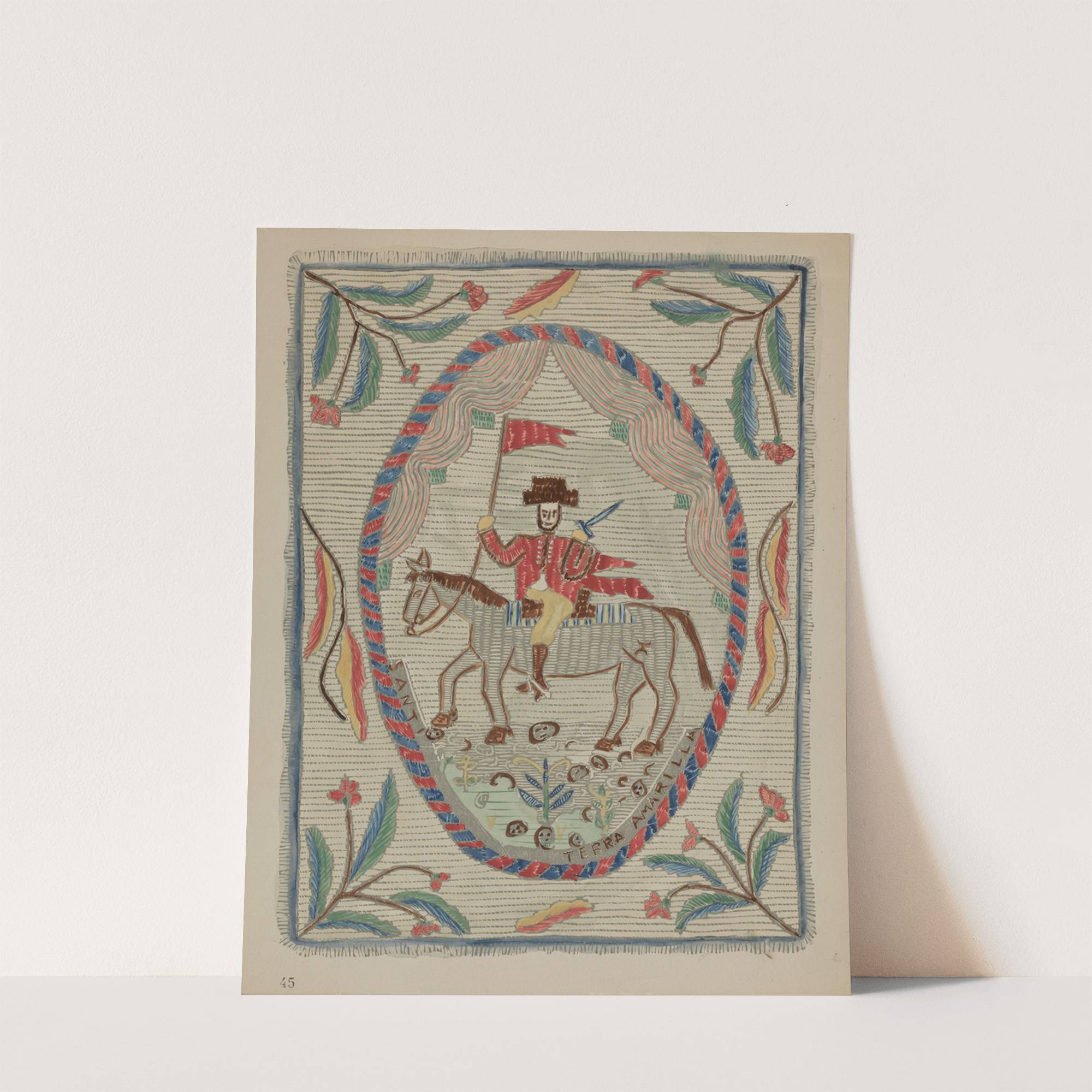 This vibrant textile art print features a colorful, historical illustration of a noble figure riding a gray horse within an oval frame adorned with intricate patterns. The central figure is dressed in a rich red military-style coat with gold accents,...