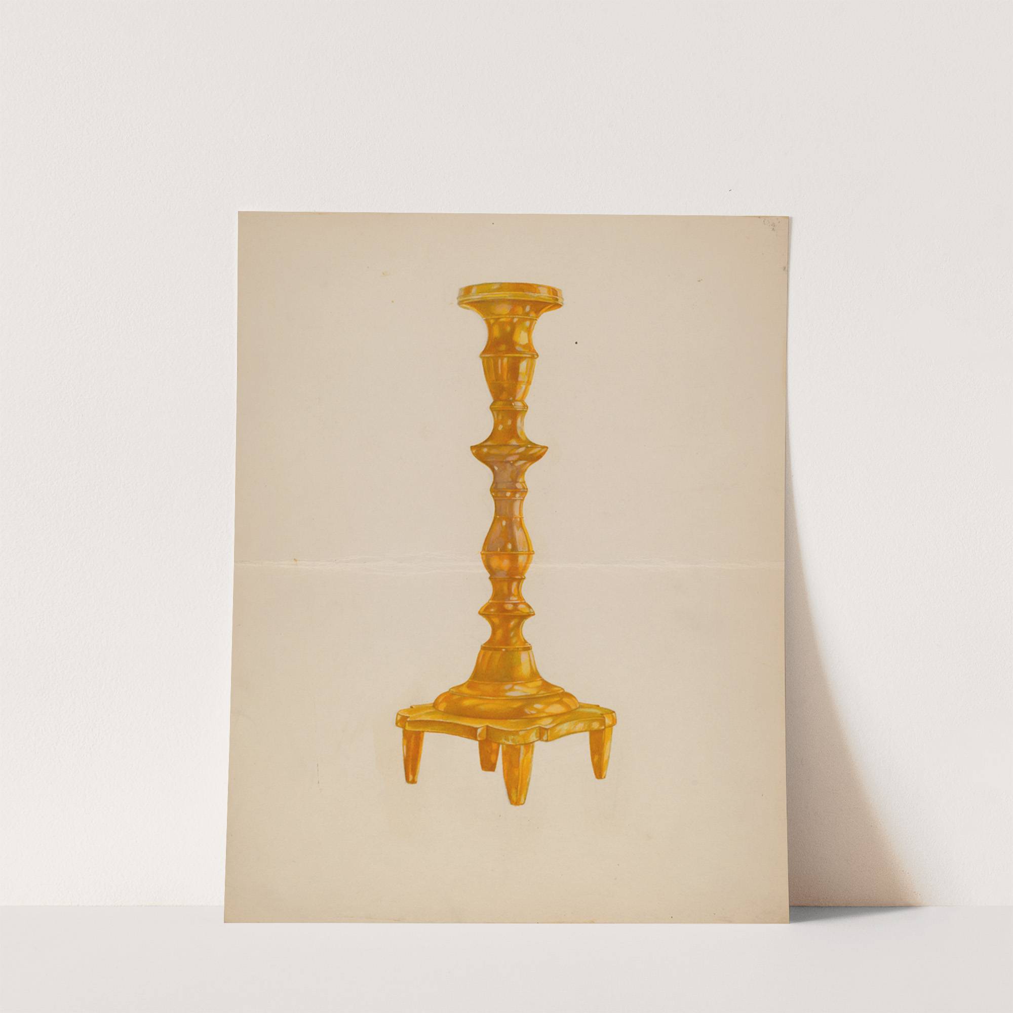 This striking art print features a tall, ornate candlestick stand in vibrant amber-orange hues. The piece is crafted with intricate detail, showcasing a series of elegant, tapered columns that gradually narrow towards the top before expanding into a sturdy base....