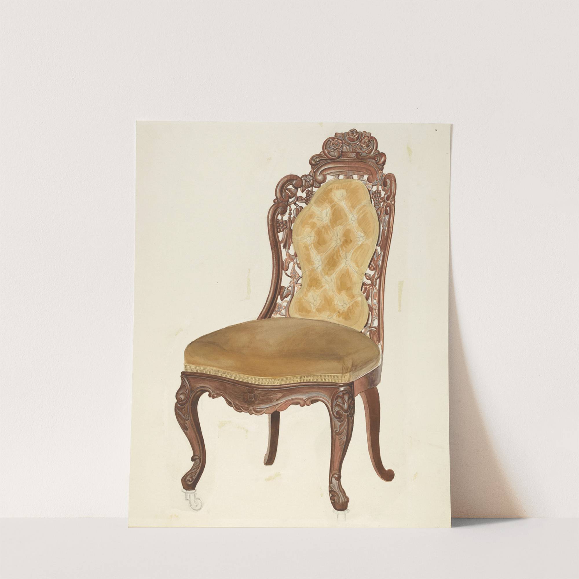 This elegant chair showcases a blend of vintage charm and sophisticated craftsmanship. The richly carved wooden frame features intricate floral patterns along the backrest and legs, highlighting traditional Baroque influences. The wood is a warm, dark brown with a glossy...