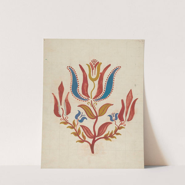 This vibrant floral design features a stylized flower with striking colors and intricate patterns, reminiscent of traditional folk art. The flower has three upward-facing petals in bold red with dotted blue accents at the tips, creating a playful contrast. At...
