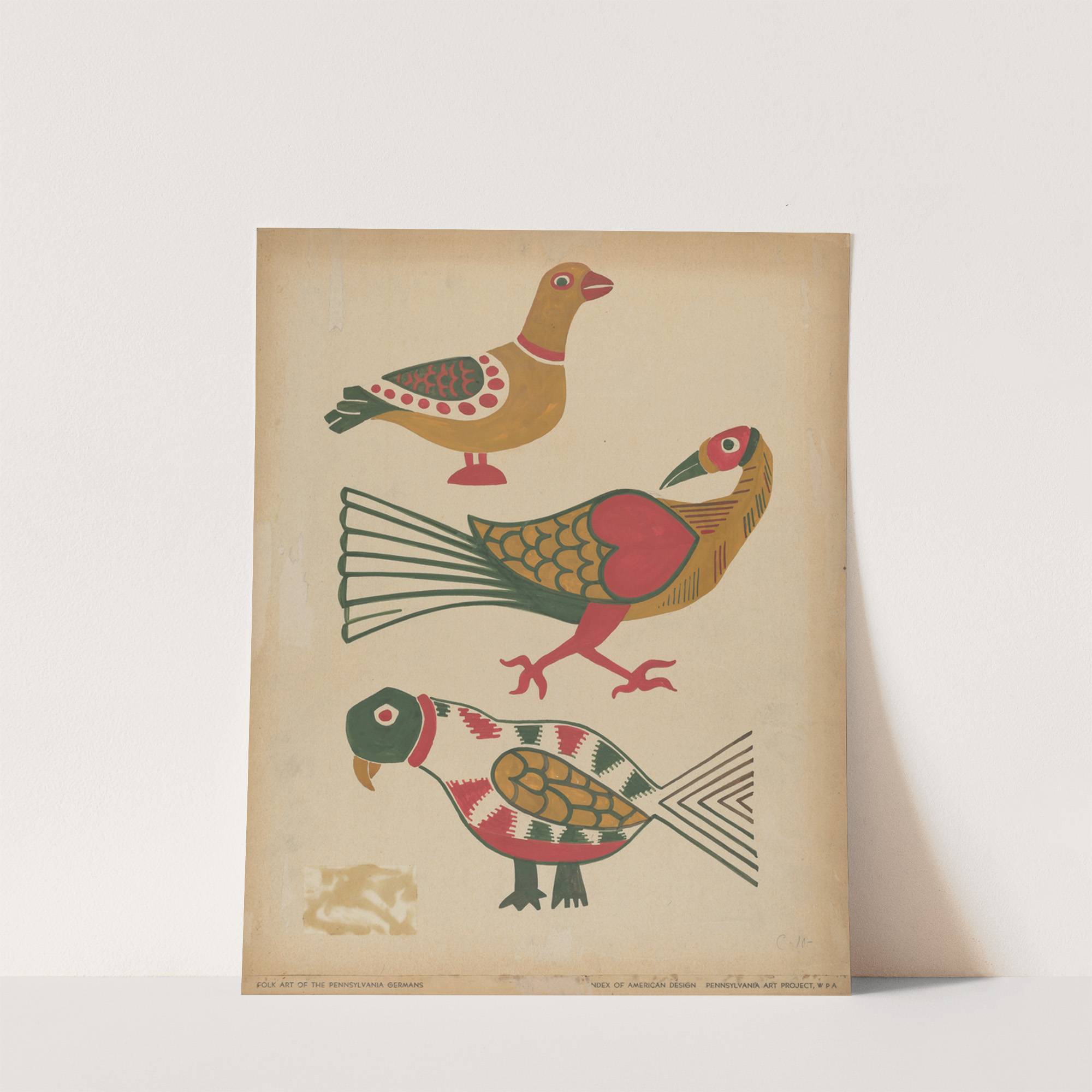 This art print features three vibrantly colored birds rendered in a bold, graphic style reminiscent of mid-20th-century folk art. The upper bird, with a golden-brown body and a striking red chest, is adorned with black and pink accents along its...