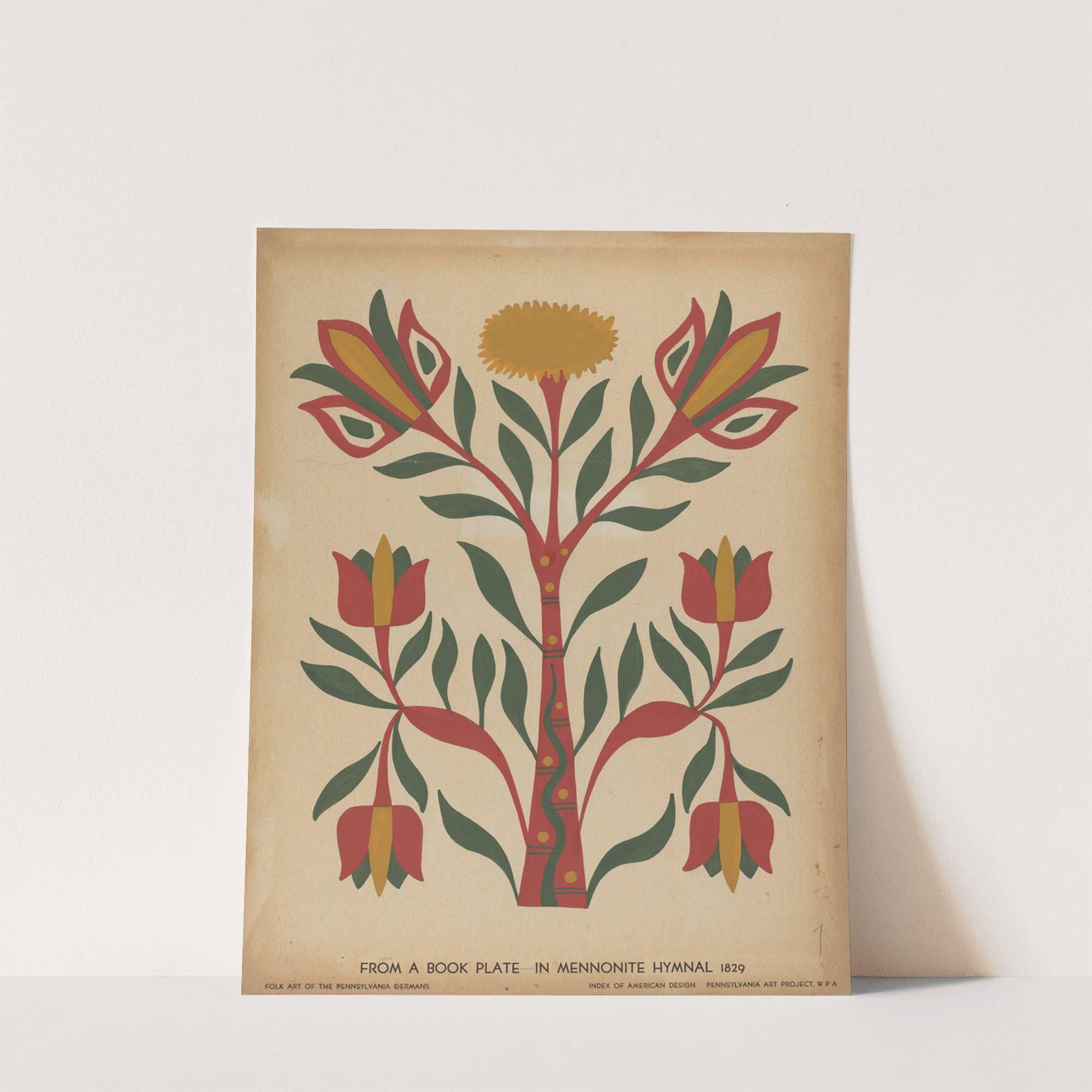 This vibrant art print features a stylized botanical illustration from the book "Folk Art of Rural Pennsylvania," created in 1929 by Henrietta McCracken. The central figure is a tall, red-stemmed plant adorned with large yellow and red flowers with green...