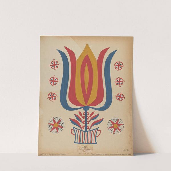 This vibrant art print features "Drawing for Plate 9" from "Folk Art of Rural Pennsylvania" by an artist associated with American 20th-century art. The composition centers around a stylized tulip motif, rendered in bold red, yellow, and blue hues. The...