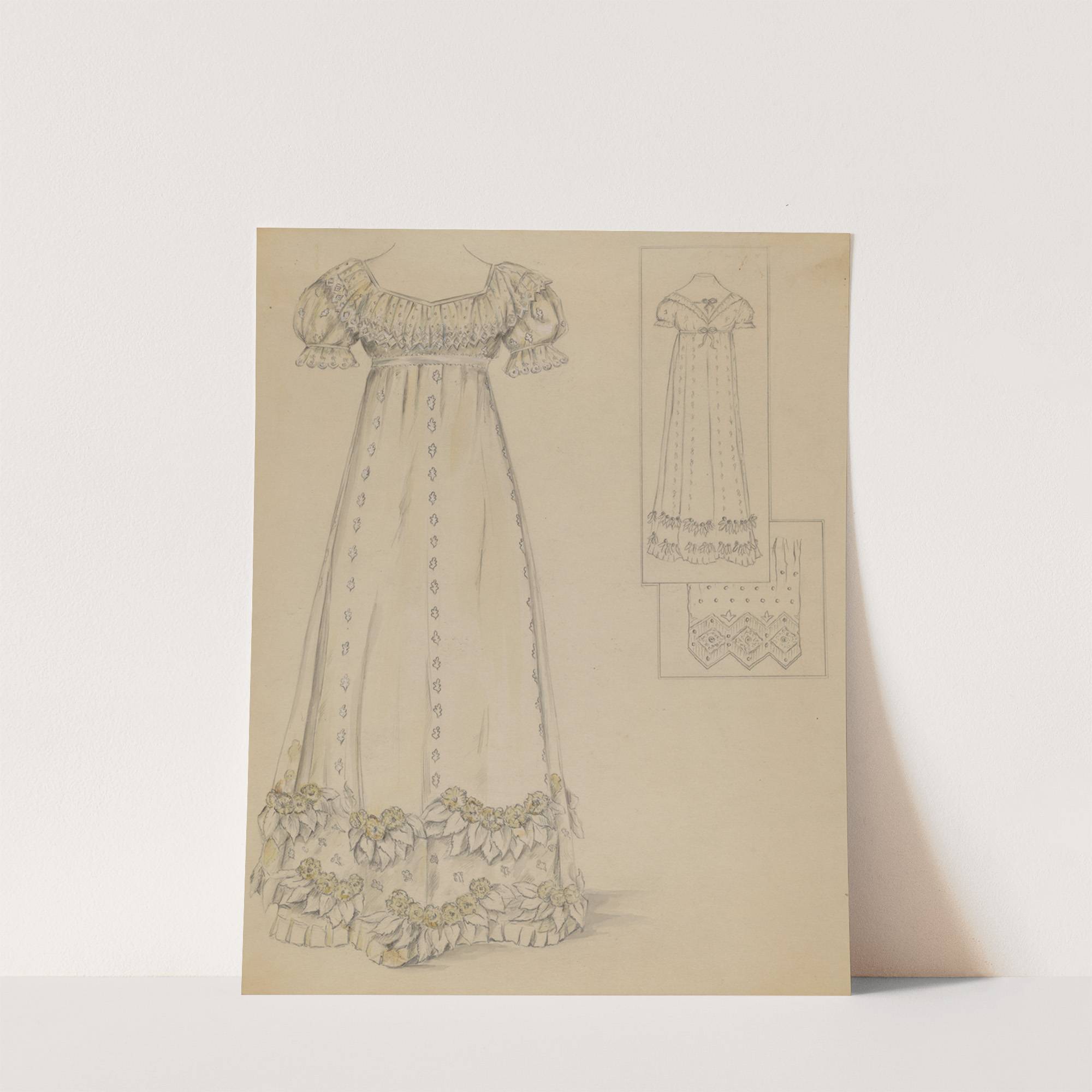 This elegant dress design showcases classic Victorian fashion with delicate attention to detail. The artwork features a long-sleeved, high-neck gown with puffed short sleeves adorned with subtle ruffles. The bodice is structured with horizontal pleats and button accents running vertically...