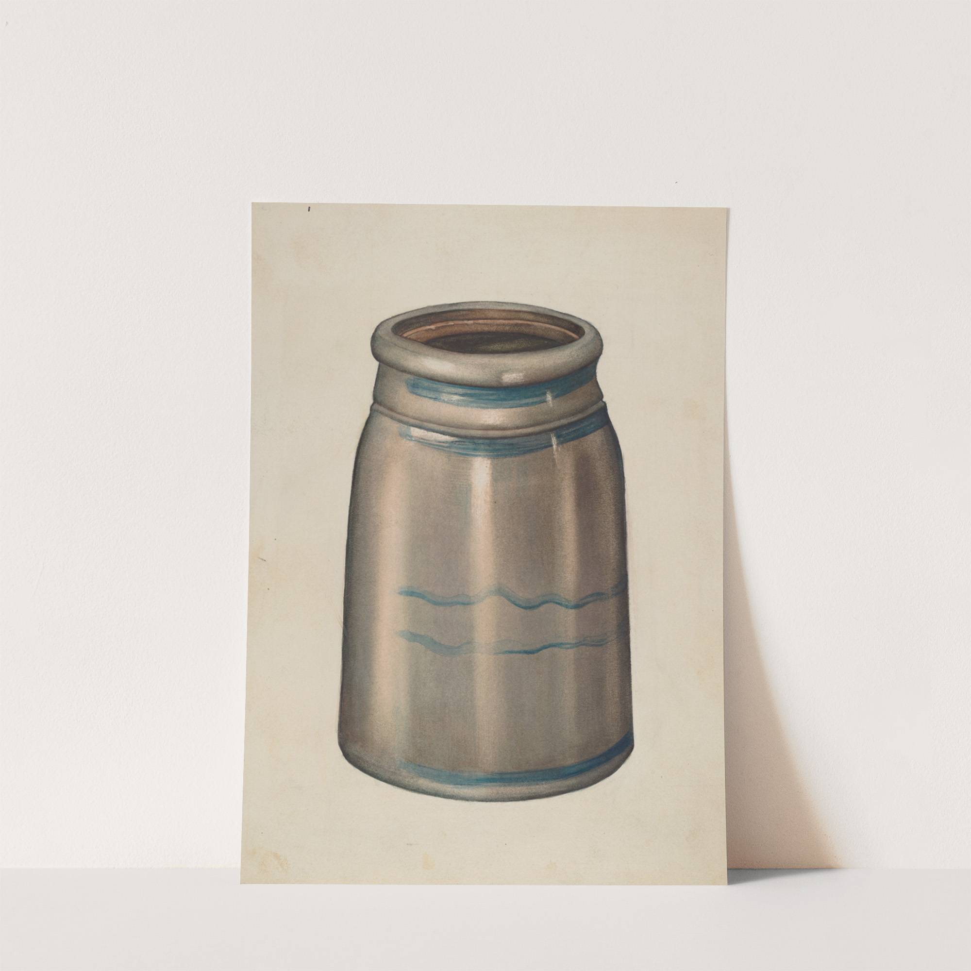 This artwork features a beautifully rendered illustration of a classic, earthenware jar. The jar is depicted in a realistic style, showcasing meticulous attention to detail and texture. Its body is slightly tapered, leading up to a rounded rim that forms...