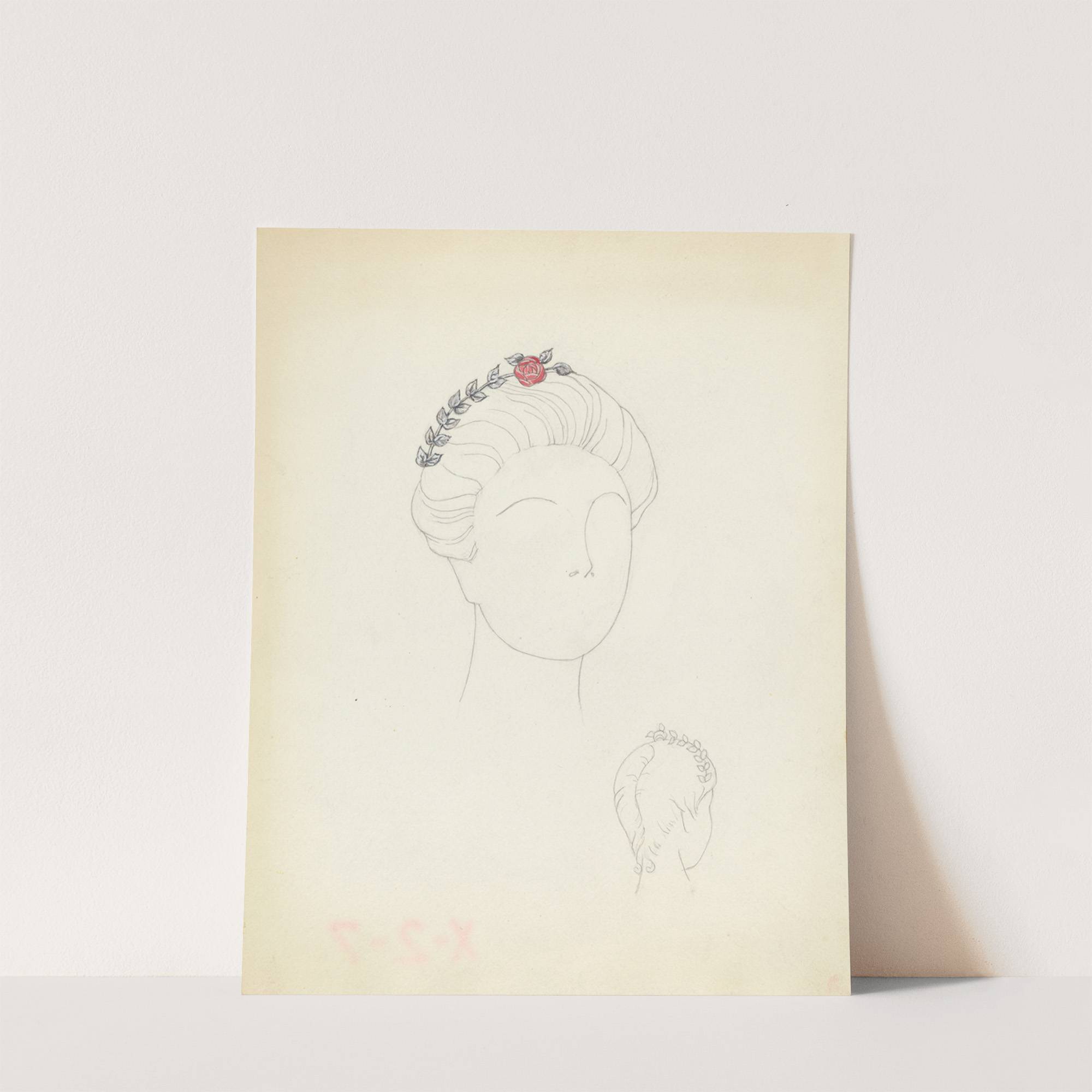 This elegant art print features a delicate line drawing of a female figure's head, adorned with a charming floral crown. The woman’s hair is gracefully styled into an intricate updo, showcasing subtle wave patterns that add to the overall sophistication...