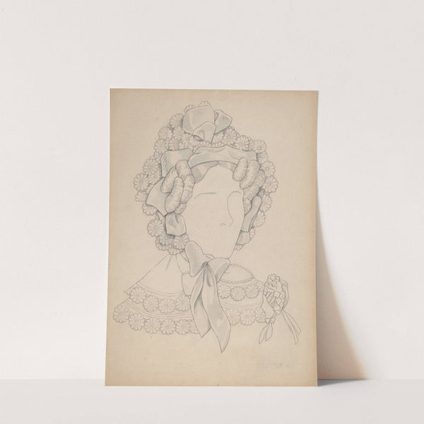 This elegant line drawing features a delicate portrait of a woman's head adorned with intricate floral embellishments. The subject is depicted in black and white, showcasing a vintage style that highlights the details of her elaborate hair arrangement and attire....
