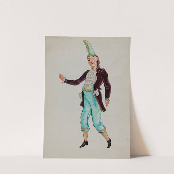This charming print features "Marionette," a whimsical illustration of a 18th-century European jester or harlequin. The figure is dressed in a vibrant, historical outfit that exudes playful elegance. His bright turquoise pants are elegantly rolled up to mid-calf, revealing his...