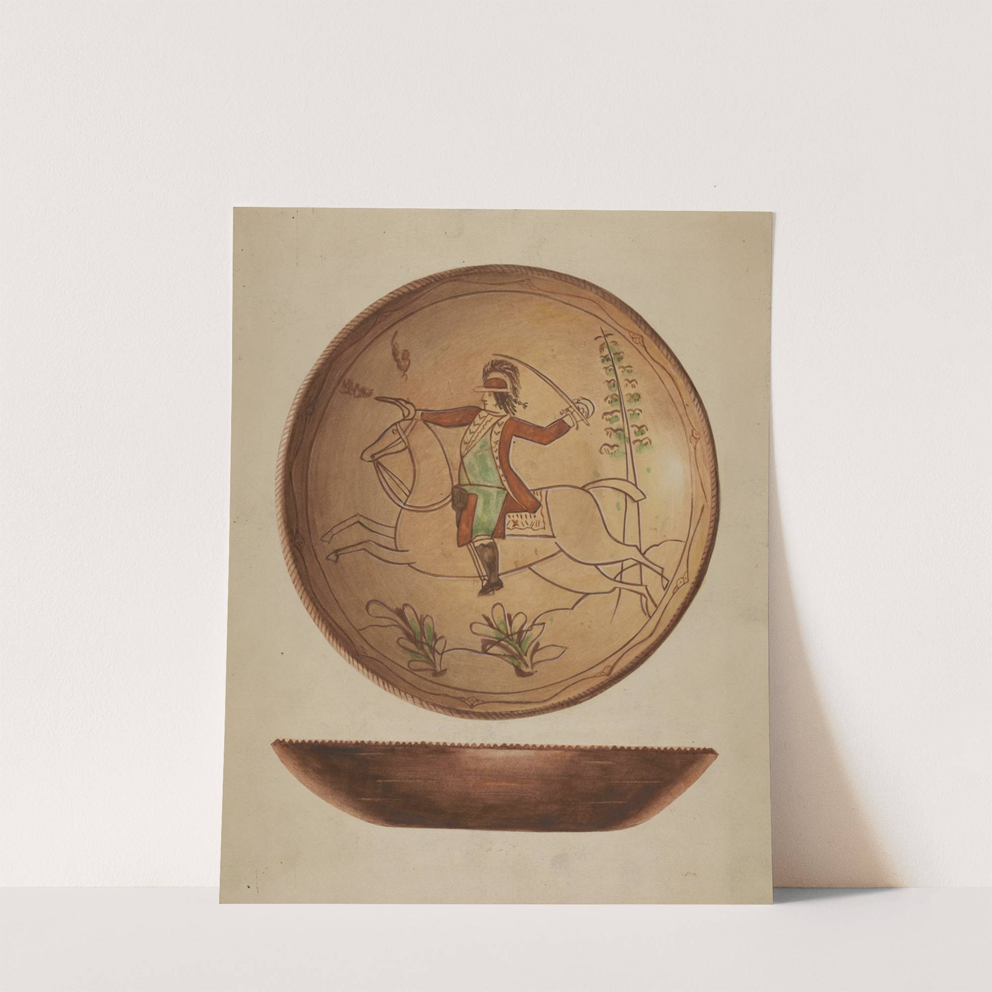 This art print features "Pa. German Pie Plate" in the style of American 20th-century illustrations. The circular plate is adorned with an intricately detailed depiction of a hunter standing on the back of a leaping deer. The hunter, dressed in...