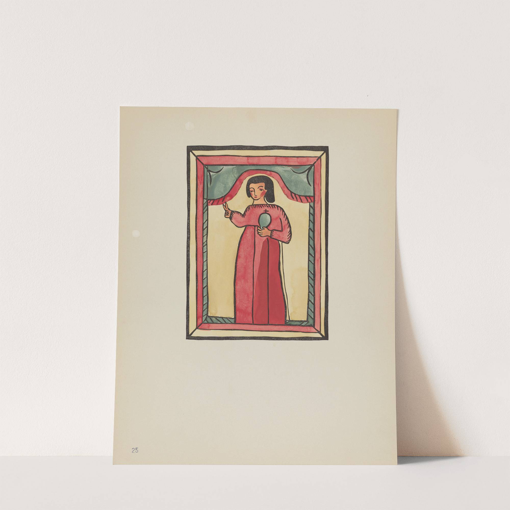 This vibrant art print features "Plate 25 – The Lost Child," part of the "Spanish Colonial Designs of New Mexico" series by American 20th-Century. The artwork showcases a stylized woman standing within an ornate rectangular frame that has a green...