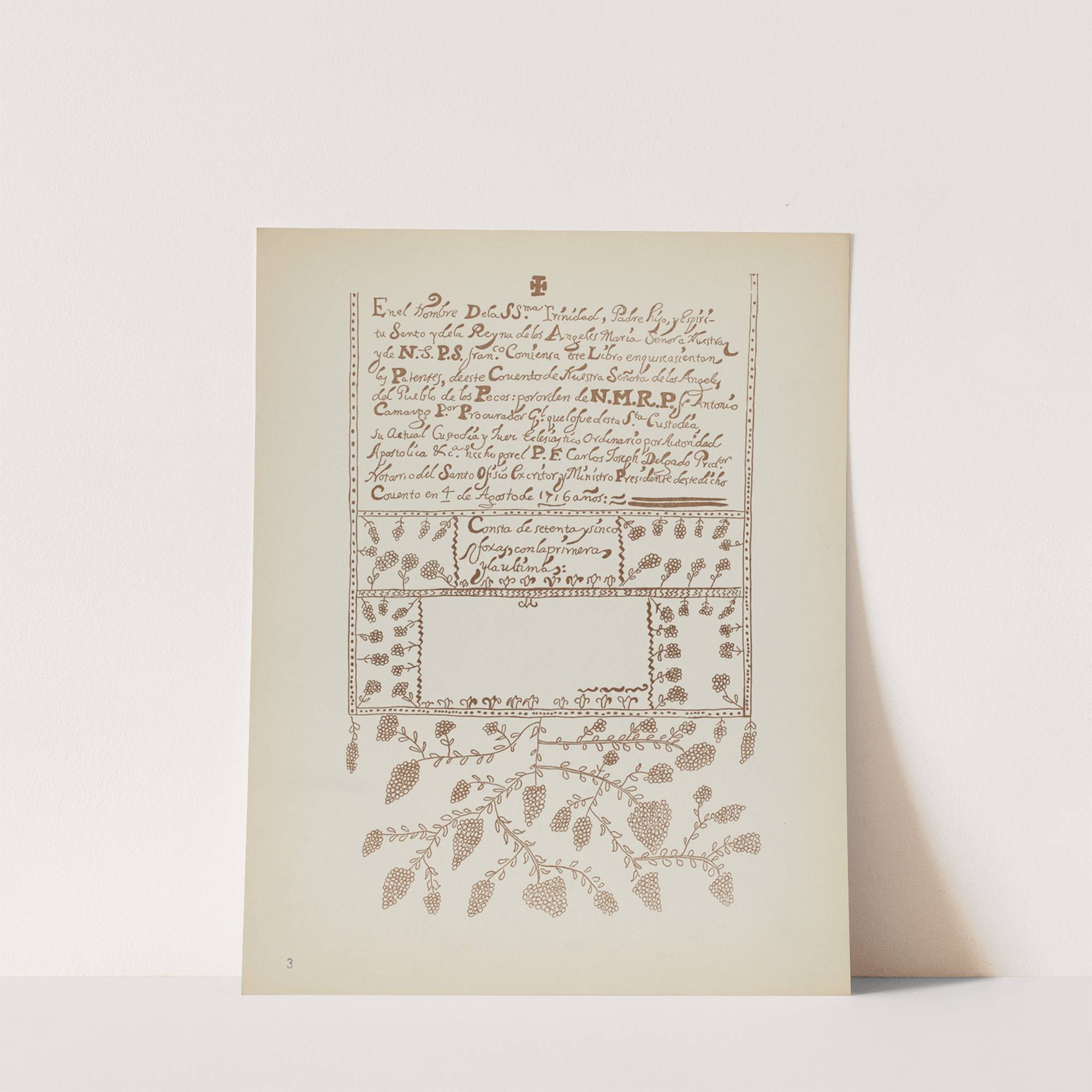 This beautifully crafted print features an intricately detailed page from the "Spanish Colonial Designs of New Mexico" portfolio, highlighting plate number three titled "Pecos Book of Visitations". The artwork is rendered in a delicate brown ink, with elegant cursive script...