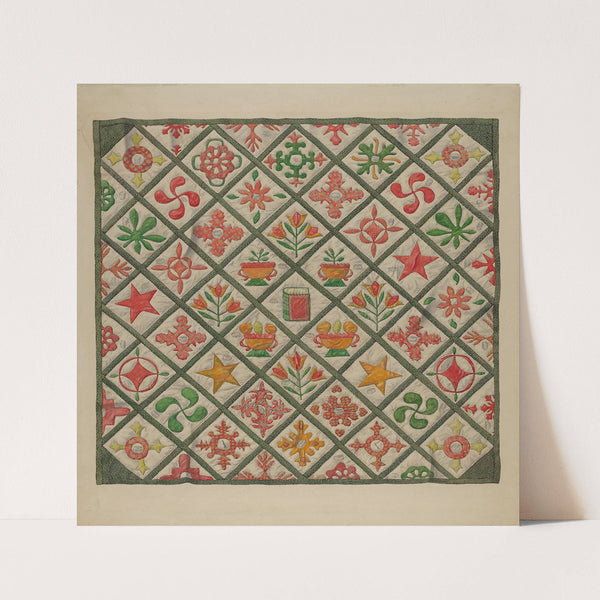 This vibrant quilt showcases a rich array of colorful floral and geometric patterns arranged in a diamond grid design. The artist has employed a traditional patchwork technique, creating an intricate and visually stimulating composition. Each diamond-shaped section features unique motifs,...