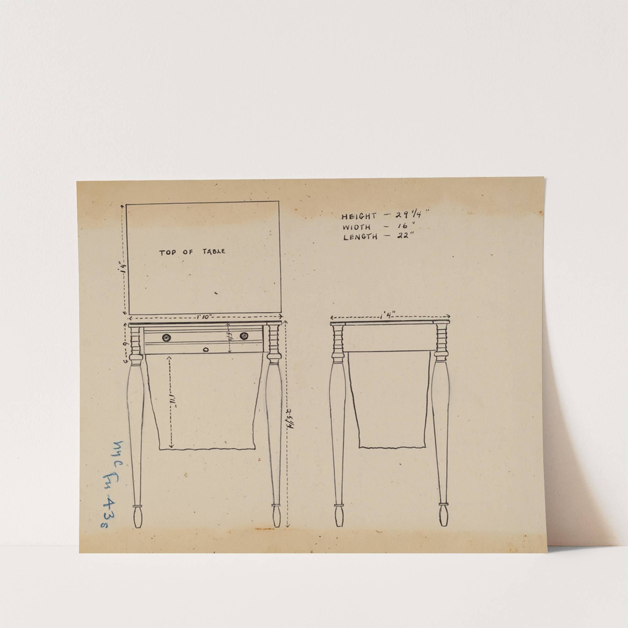 This is a detailed technical drawing of a sewing table design, created in a classic vintage style using black ink on aged yellowed paper. The image features two side-by-side illustrations of the top of a sewing table, labeled "Top of...