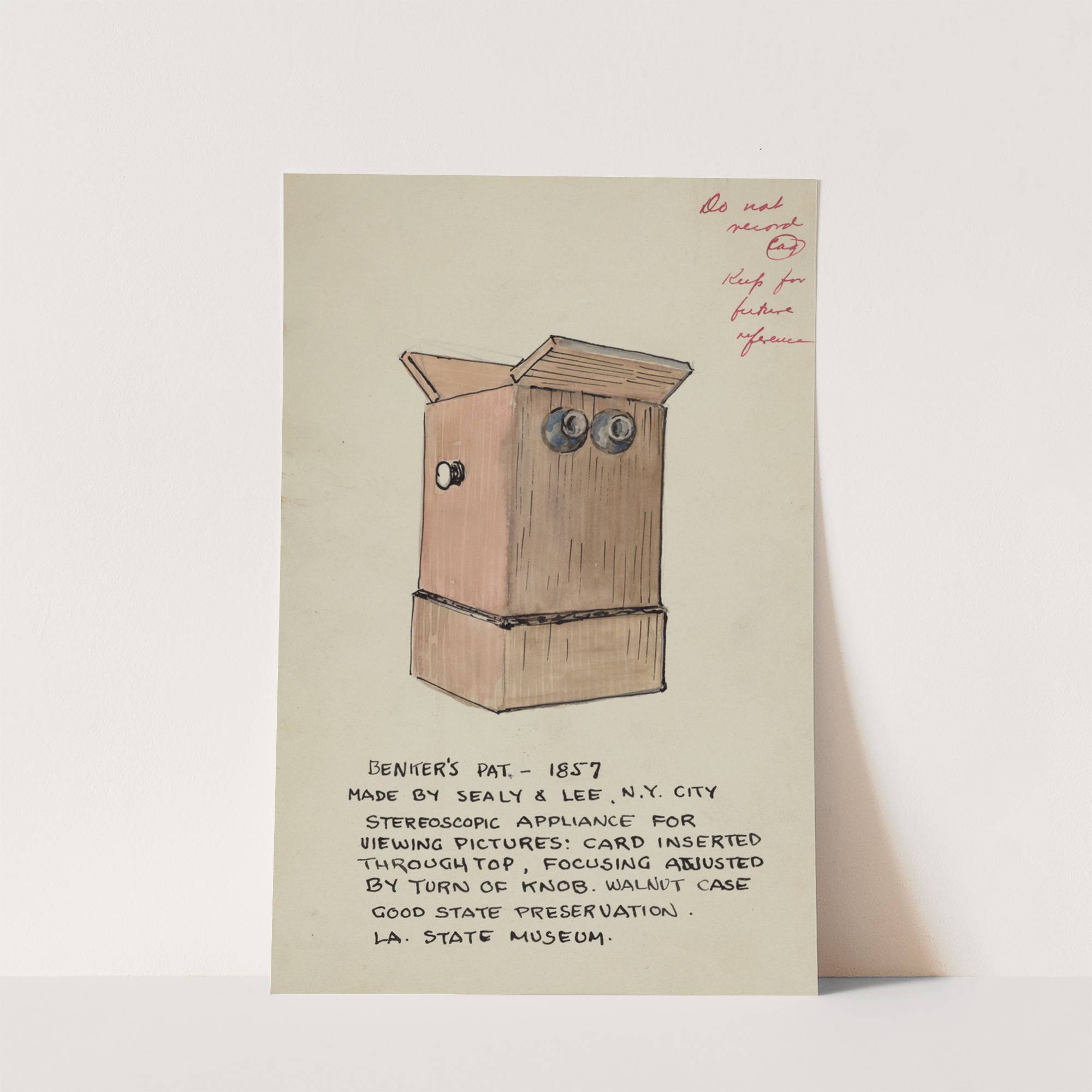 This whimsical art print features a charming, hand-drawn cardboard stereoscope viewer with two large, round eyes peering out from the top of its rectangular wooden box structure. The artwork is signed in red ink at the top right corner, adding...