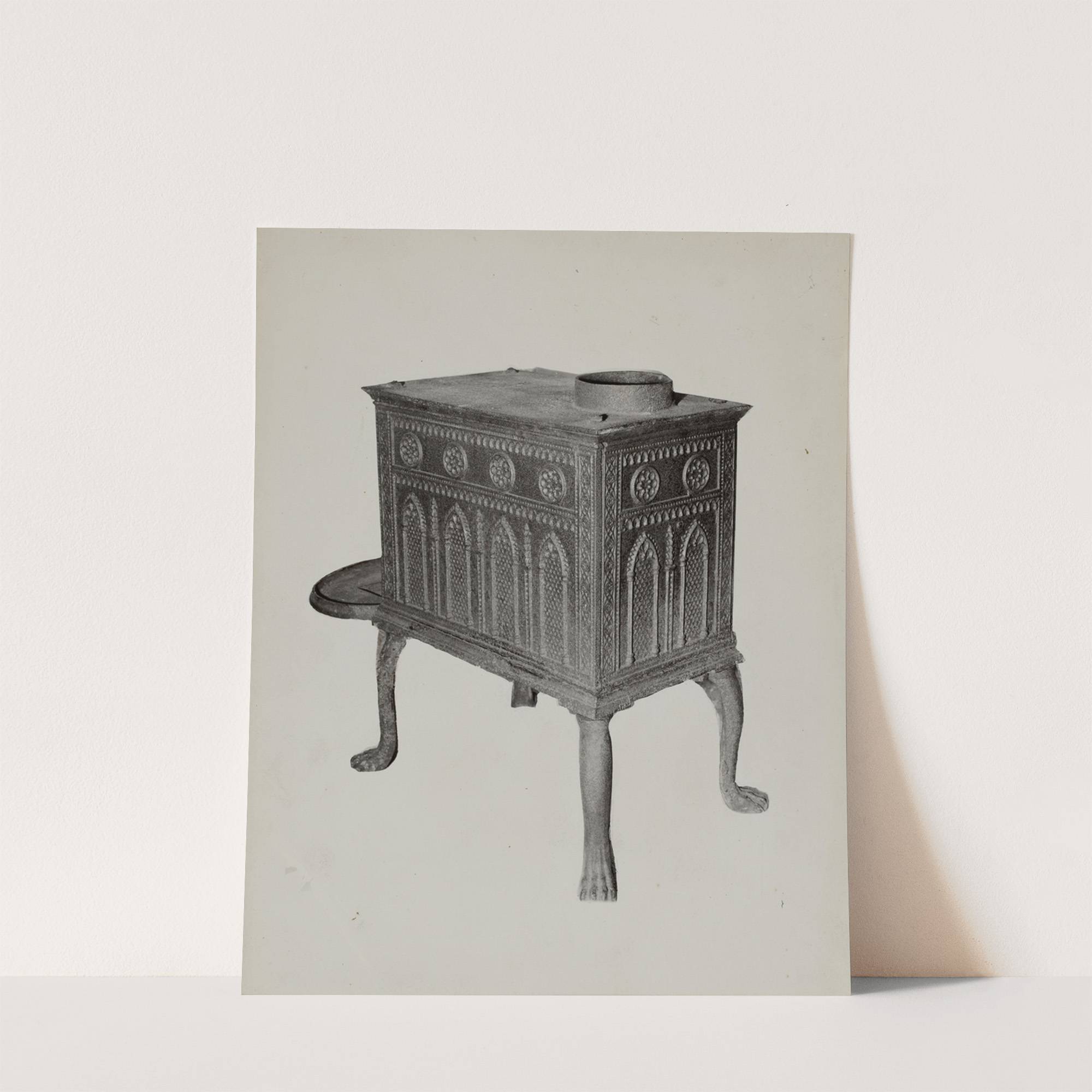 This striking art print features "Stove," a piece created in the style of traditional European furniture design from the American 20th century period. The stove is intricately detailed with elegant architectural elements, including arched windows and decorative patterns that add...