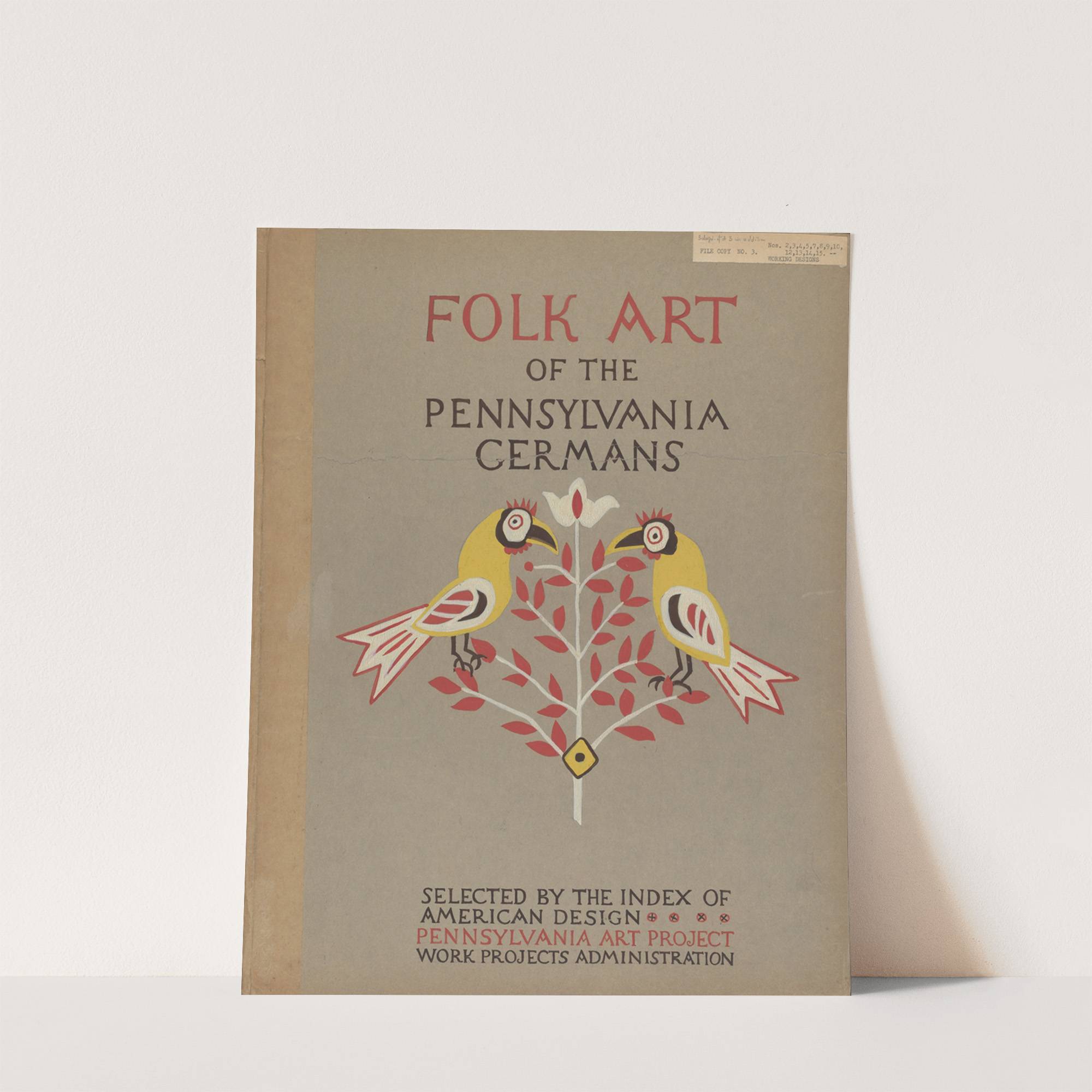 This vibrant art print showcases "Study for Portfolio Cover – Folk Art of the Pennsylvania Germans." The cover features two stylized birds perched on a simple white tree with red leaves, positioned centrally. The birds, rendered in bright yellow and...