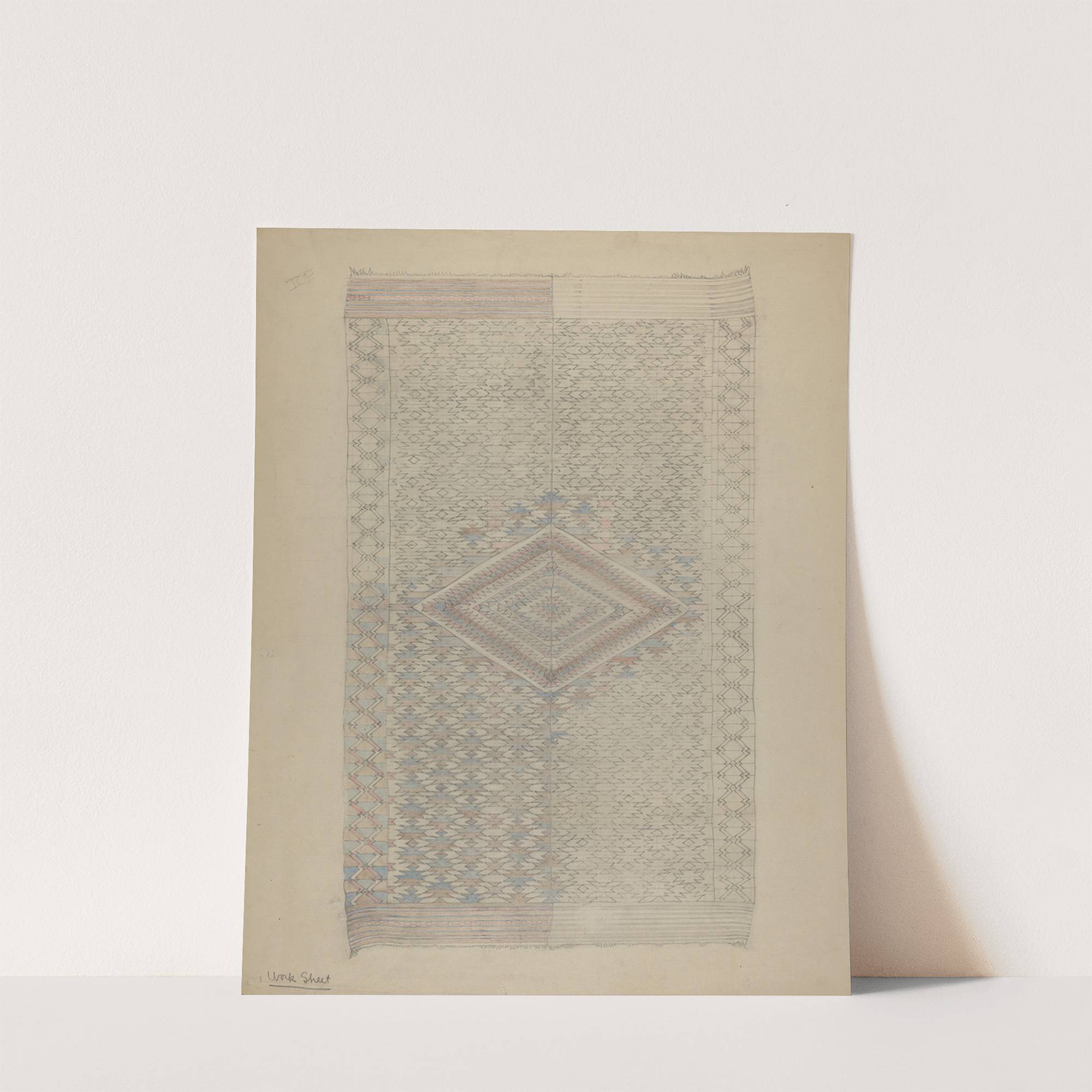 This artwork is a detailed textile design, showcasing the intricate beauty of traditional craft. The piece features an ornate pattern centered around a diamond motif, which is bordered by symmetrical geometric motifs in various shades of blue, pink, and red....