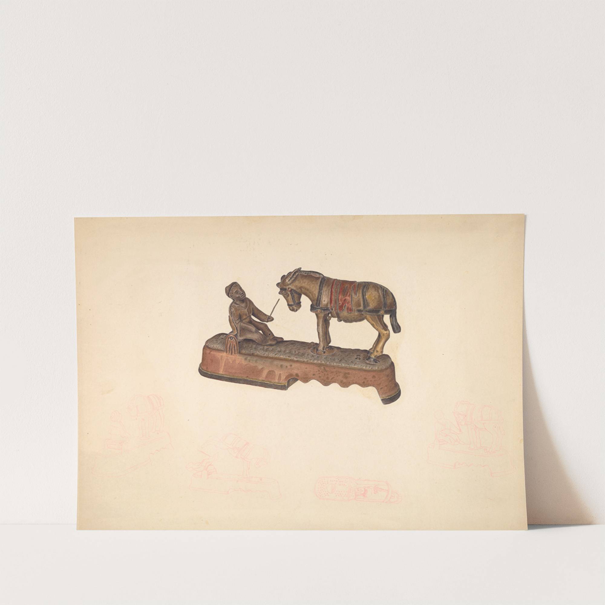 This art print showcases "Toy Bank – Mule" by the artist known as American 20th Century. The piece depicts a rustic, handcrafted scene featuring a life-sized mule standing on a small, earthen platform. The mule is adorned with colorful red...