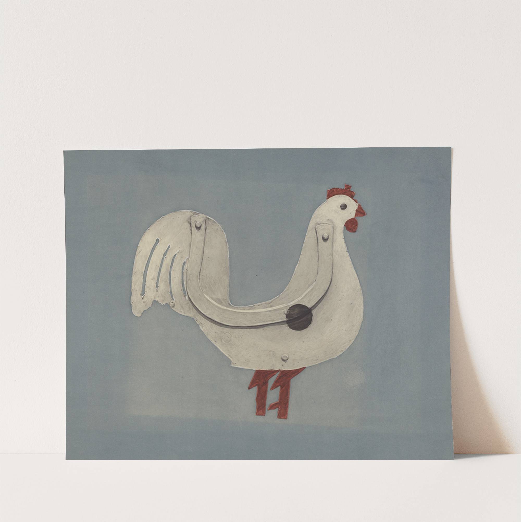 This charming art print features a stylized rooster standing against a soft blue background. The rooster is rendered in clean, minimalist shapes with a white body, red legs, and black wing tips. Its tail feathers are elegantly curved upward, showcasing...