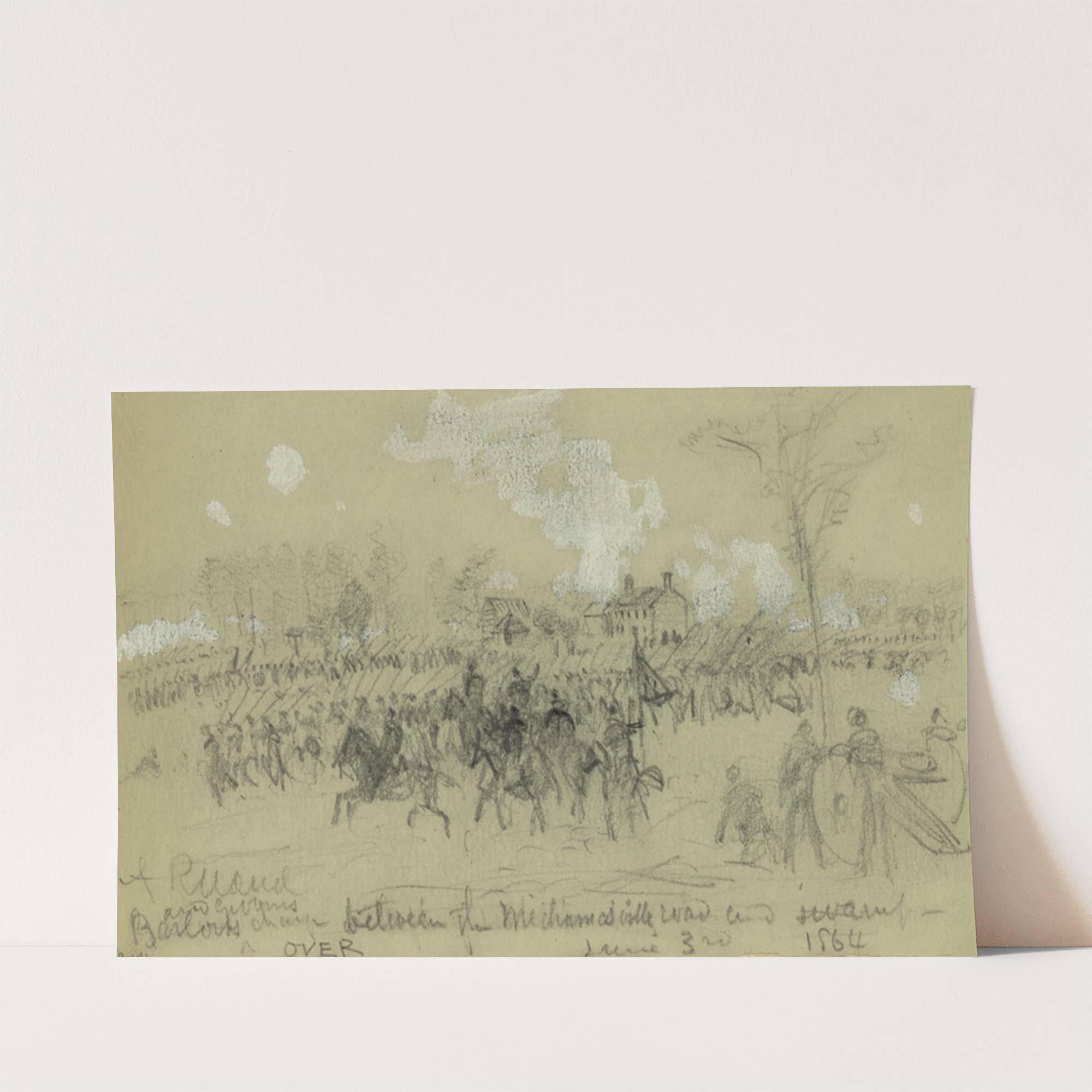 This evocative art print captures "Between Mechanicsville Road and Swamp, June 3rd, 1864" in a delicate pencil drawing style. The image depicts a chaotic battlefield scene with a multitude of soldiers and horses in mid-charge across the landscape. The artist's...