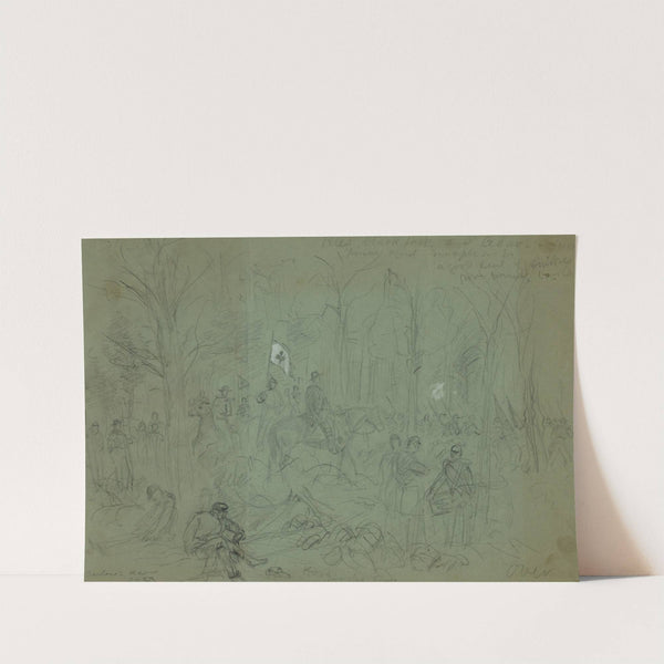 This art print is titled "Wilderness Campaign" by Alfred Rudolph Waud, capturing a dynamic scene of Civil War-era soldiers in a forest clearing. The pencil sketch on greenish paper features finely detailed, loose yet expressive lines that create a sense...