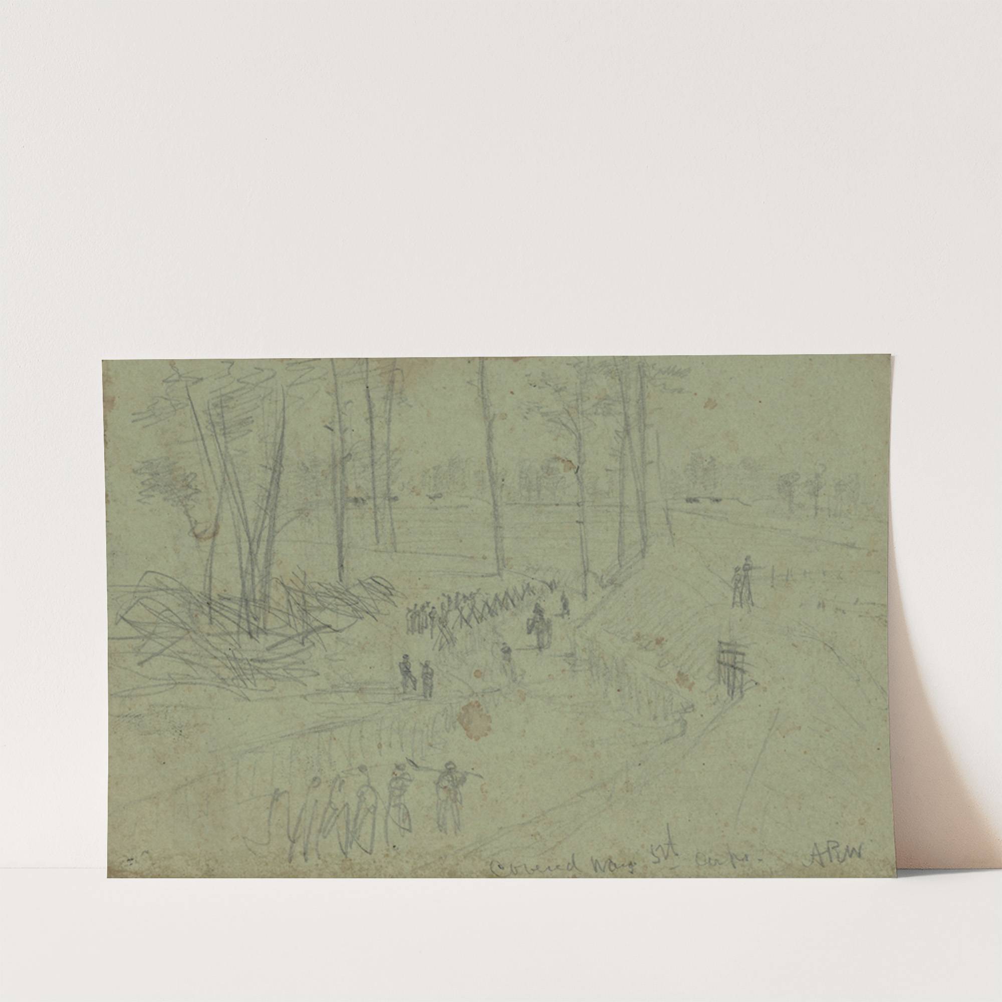 This artwork, titled "Covered Way 5th Corps" by Alfred Rudolph Waud, is a delicate pencil sketch on aged, slightly yellowed paper, evoking an impressionistic sense of history and nature. The composition features a group of soldiers marching through a forested...
