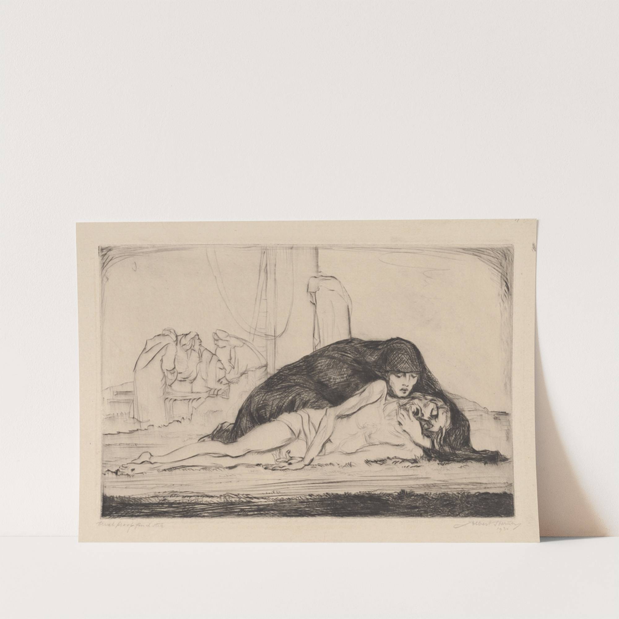 This black-and-white drawing titled "Eternal" by artist Albert Sterner captures an intense and evocative scene with remarkable detail and emotion. The central figure is a woman with long dark hair lying on the floor, her nude body partially covered by...