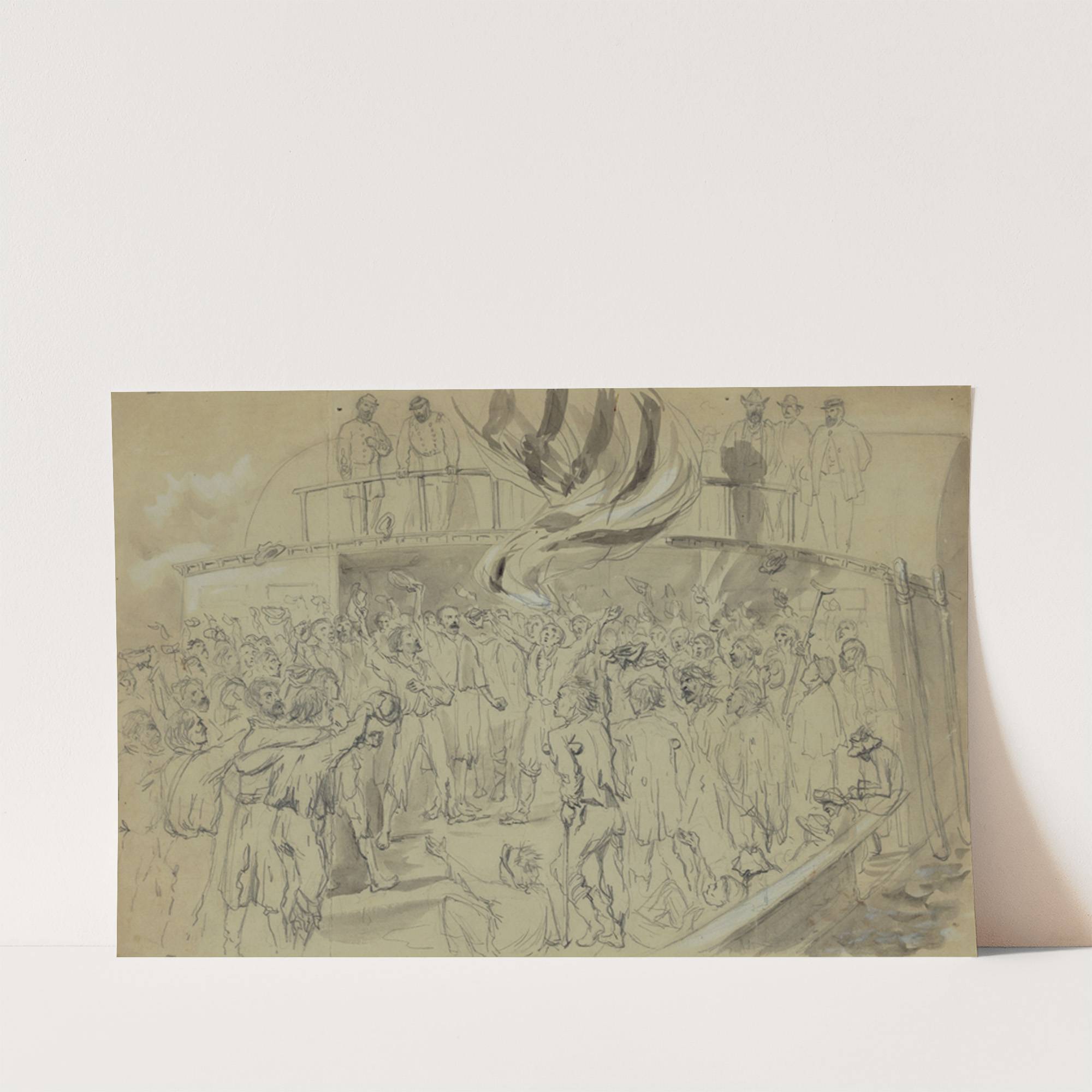 This striking pencil drawing captures a bustling historical scene aboard the dispatch boat "Liza Hancock," during the American Civil War era. The artwork is titled "Exchanged (Union) Prisoners" and was created by Alfred Rudolph Waud. The image is rendered in...