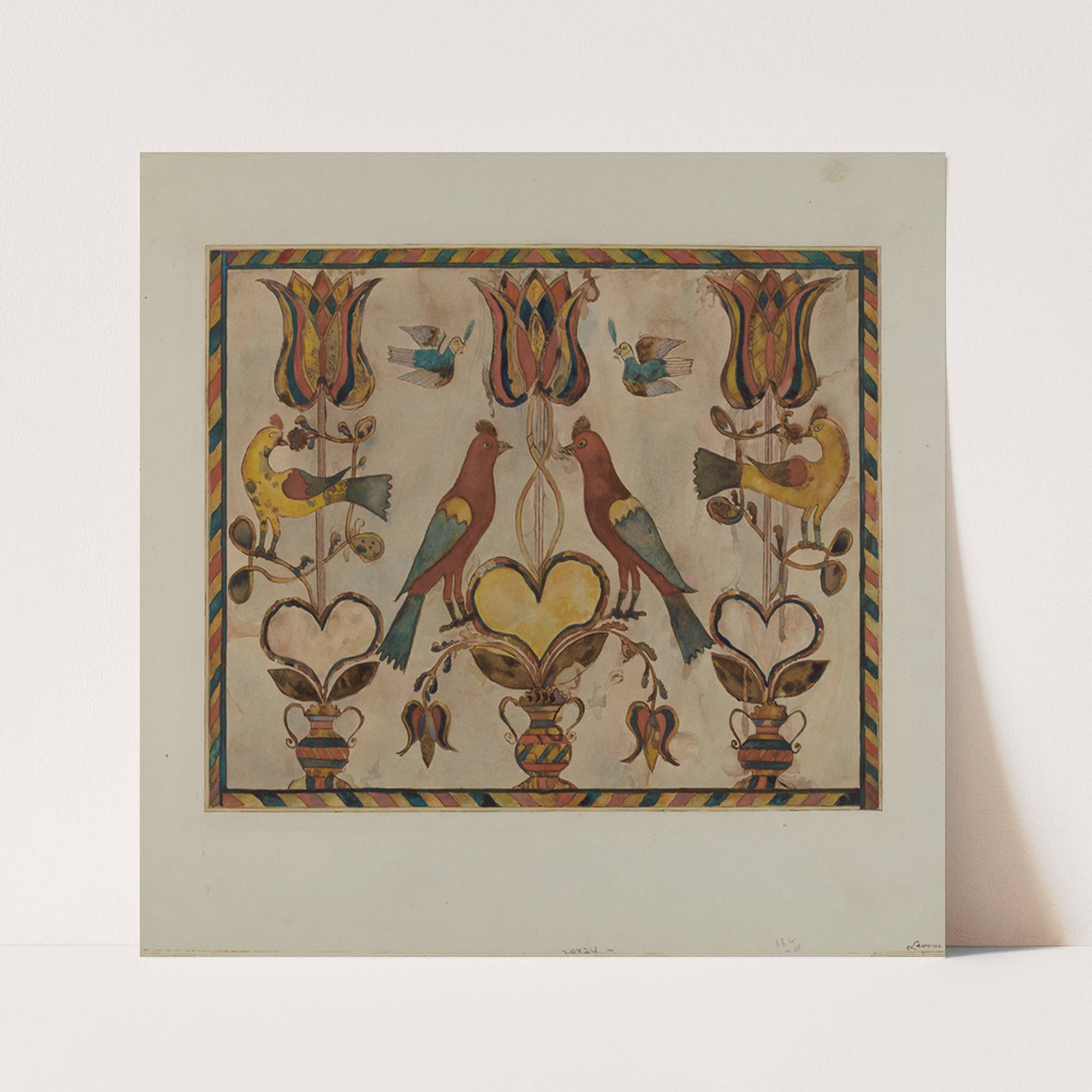 This vibrant artwork titled "Fracture" by artist Albert Levone features a symmetrical composition of colorful birds and floral elements set against an off-white background. At the center, two red birds face each other, perched atop a yellow heart-shaped flower that...