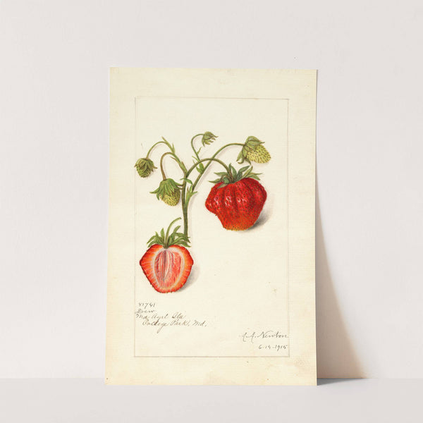 Experience the delicate beauty of nature captured with precision in "Fragaria: Dew" by Amanda Almira Newton. This stunning art print features three strawberries, each meticulously rendered in a realistic yet artistically expressive style. Two vibrant red strawberries are prominently displayed—one...