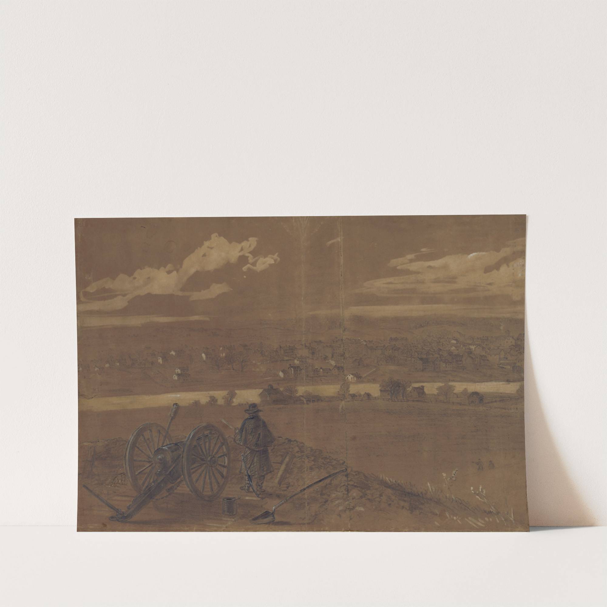 This artwork, titled "Fredericksburg, Va." by Alfred Rudolph Waud, presents a tranquil yet contemplative historical scene rendered in sepia tones. The piece captures the rustic beauty of an early American landscape with meticulous detail.In the foreground, a solitary soldier stands...
