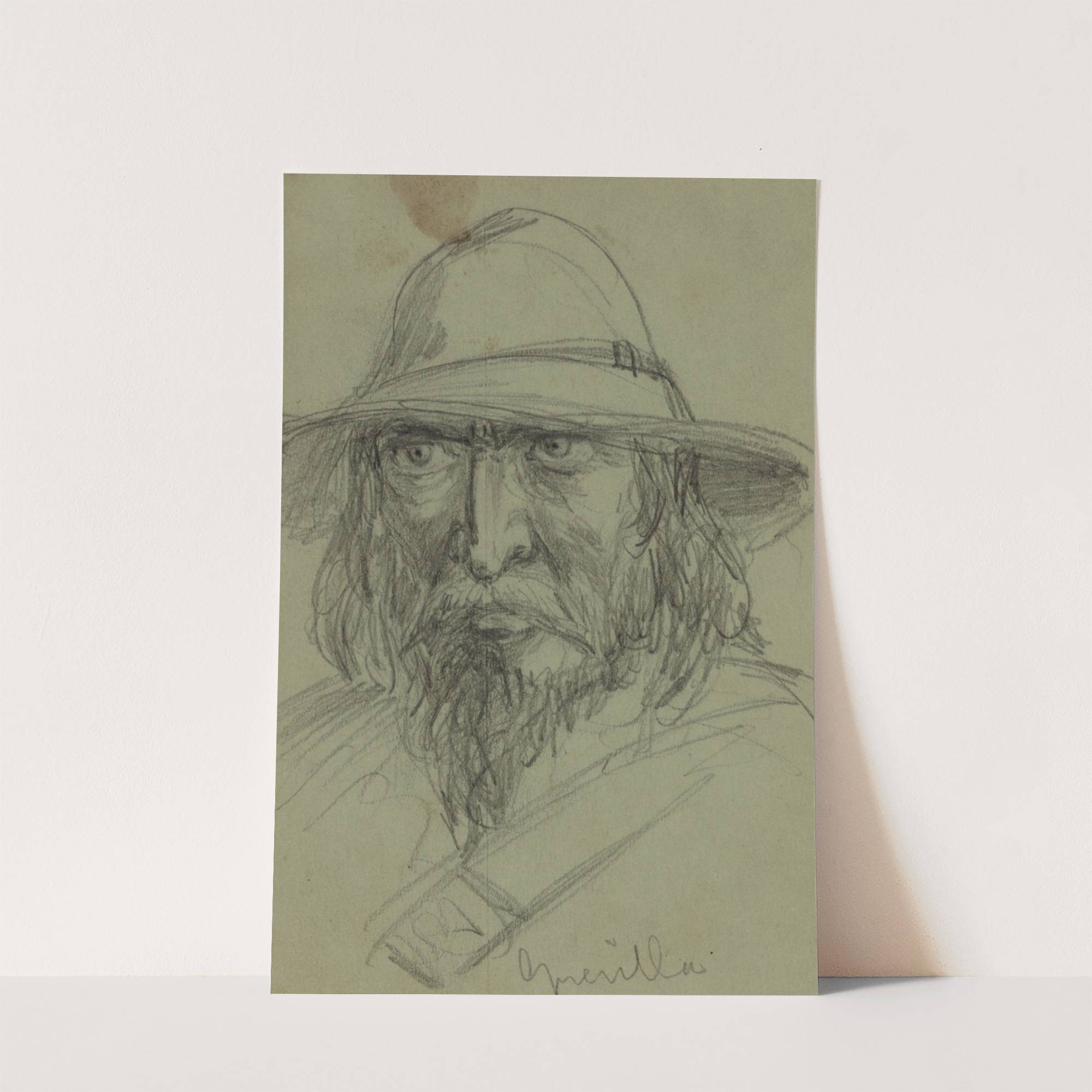This art print features "Guerilla" by Alfred Rudolph Waud, showcasing a striking pencil sketch of a bearded man in profile. The subject wears a broad-brimmed hat that casts shadows over his intense eyes, giving him a contemplative and somewhat mysterious...