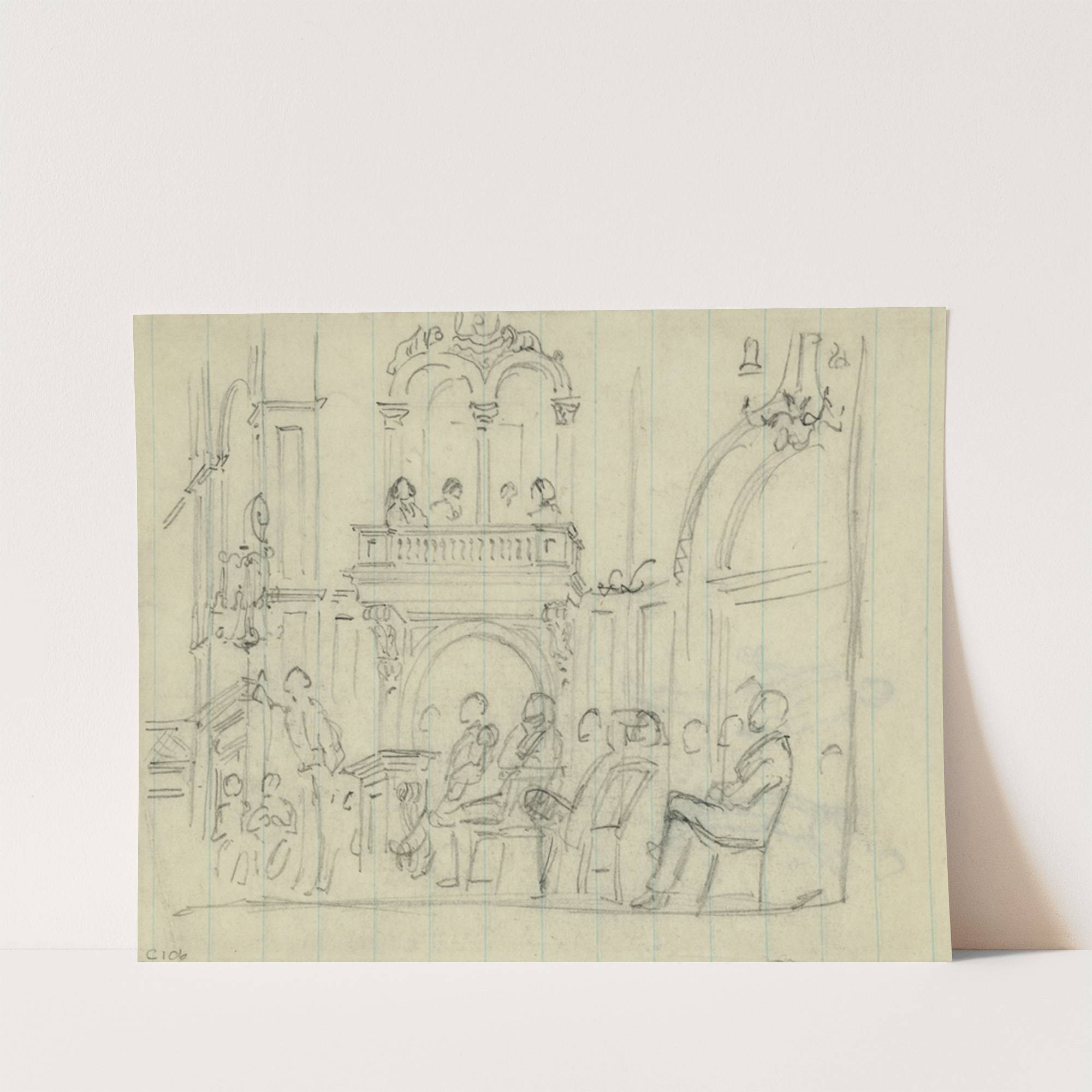 This elegant pencil sketch captures the serene interior of a church, beautifully detailed yet maintaining a delicate, minimalist approach. The drawing features several individuals seated in rows within the spacious, ornate church setting. Above them, an elevated altar is adorned...