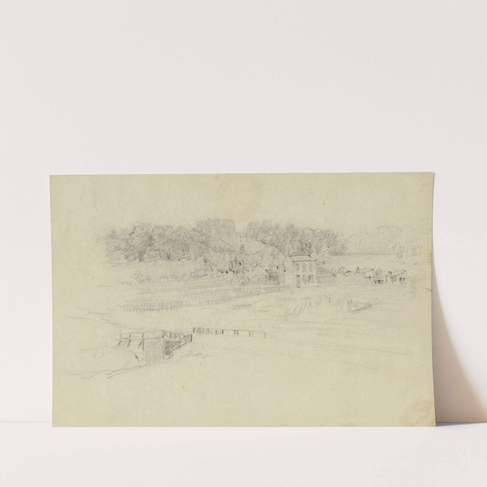 This elegant pencil landscape print features "Landscape with Buildings" by Alfred Rudolph Waud. The artwork showcases a serene rural scene with meticulous attention to detail. In the foreground, there is a gently sloping field that leads into a small village...