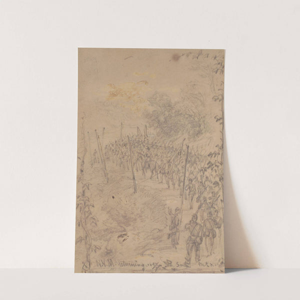 This art print depicts "N.Y.M. returning over South Mt." by Alfred Rudolph Waud, rendered in delicate pencil sketches on a slightly textured beige paper. The scene captures a bustling military encampment, with numerous soldiers marching along a dirt path that...