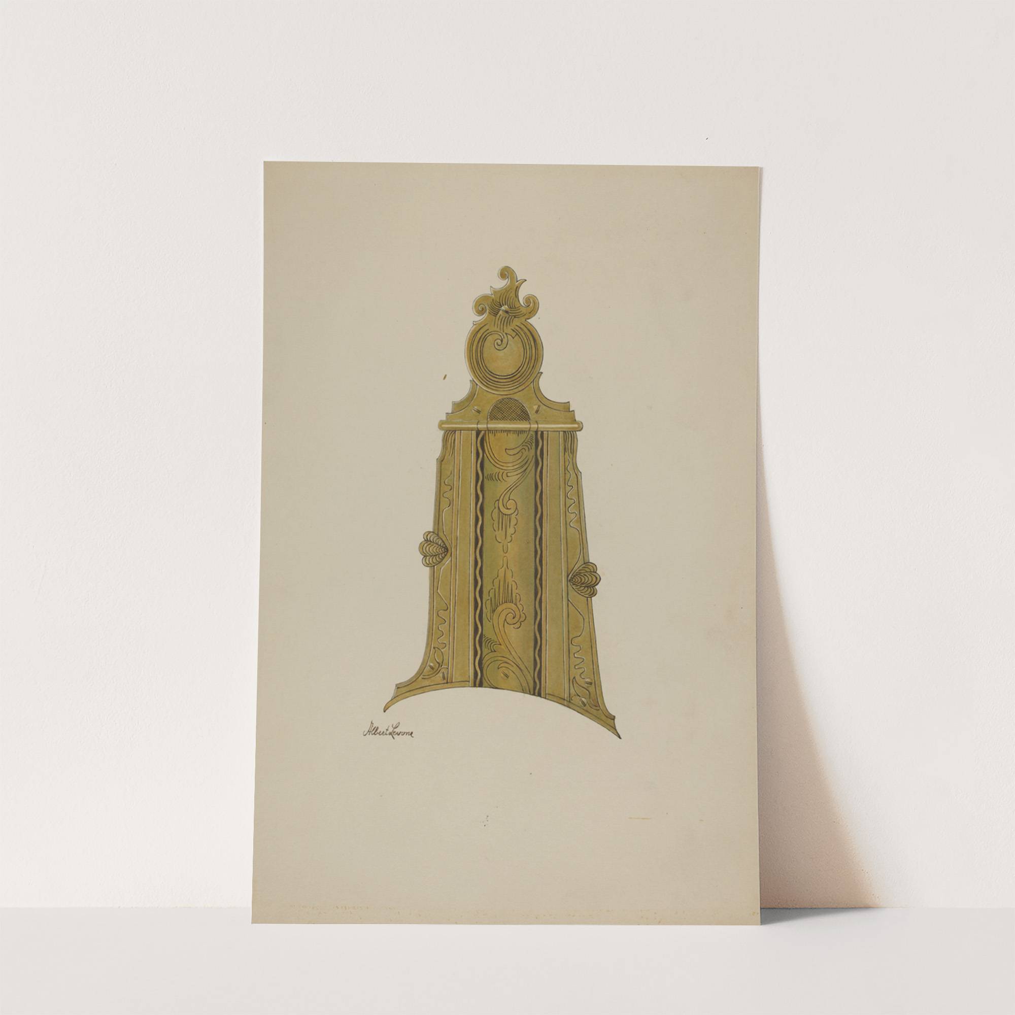 This beautifully detailed illustration captures the intricate design of a historic wooden headboard, rendered in a warm, golden hue. The artwork showcases the ornate carvings and patterns typical of classic woodworking craftsmanship. The headboard features an elegant crown-like top with...