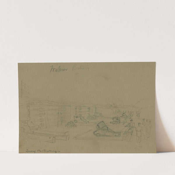 This charming pencil sketch by Alfred Rudolph Waud captures a serene urban street scene with a light, delicate touch. The artwork features a series of buildings in the background, drawn with simple lines that evoke their rectangular shapes and architectural...