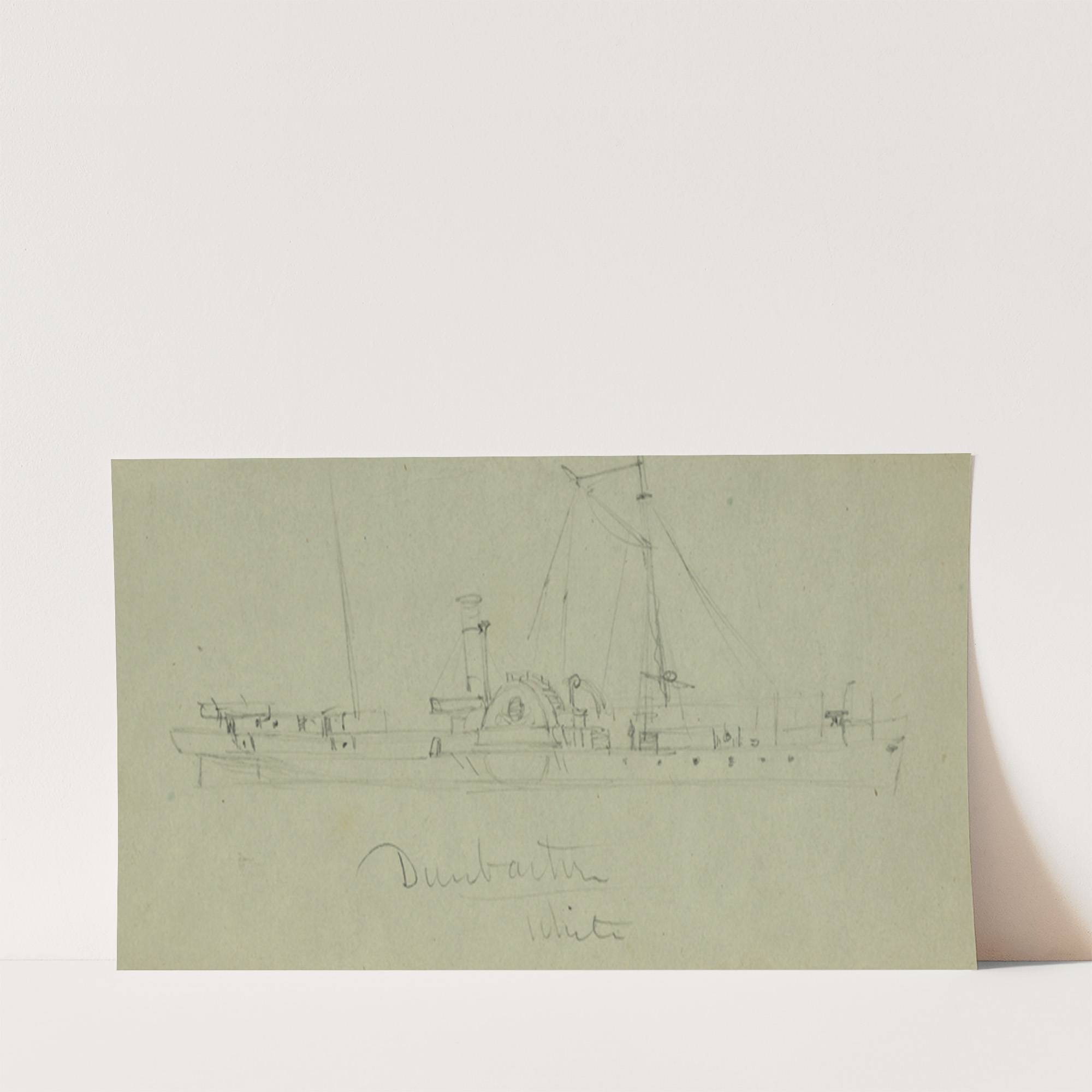 This is a beautifully detailed pencil sketch of the steamship "Dunbarton," created by renowned artist Alfred Rudolph Waud. The image captures the ship in meticulous line work, showcasing its distinct features with precision. The ship is depicted from a side...