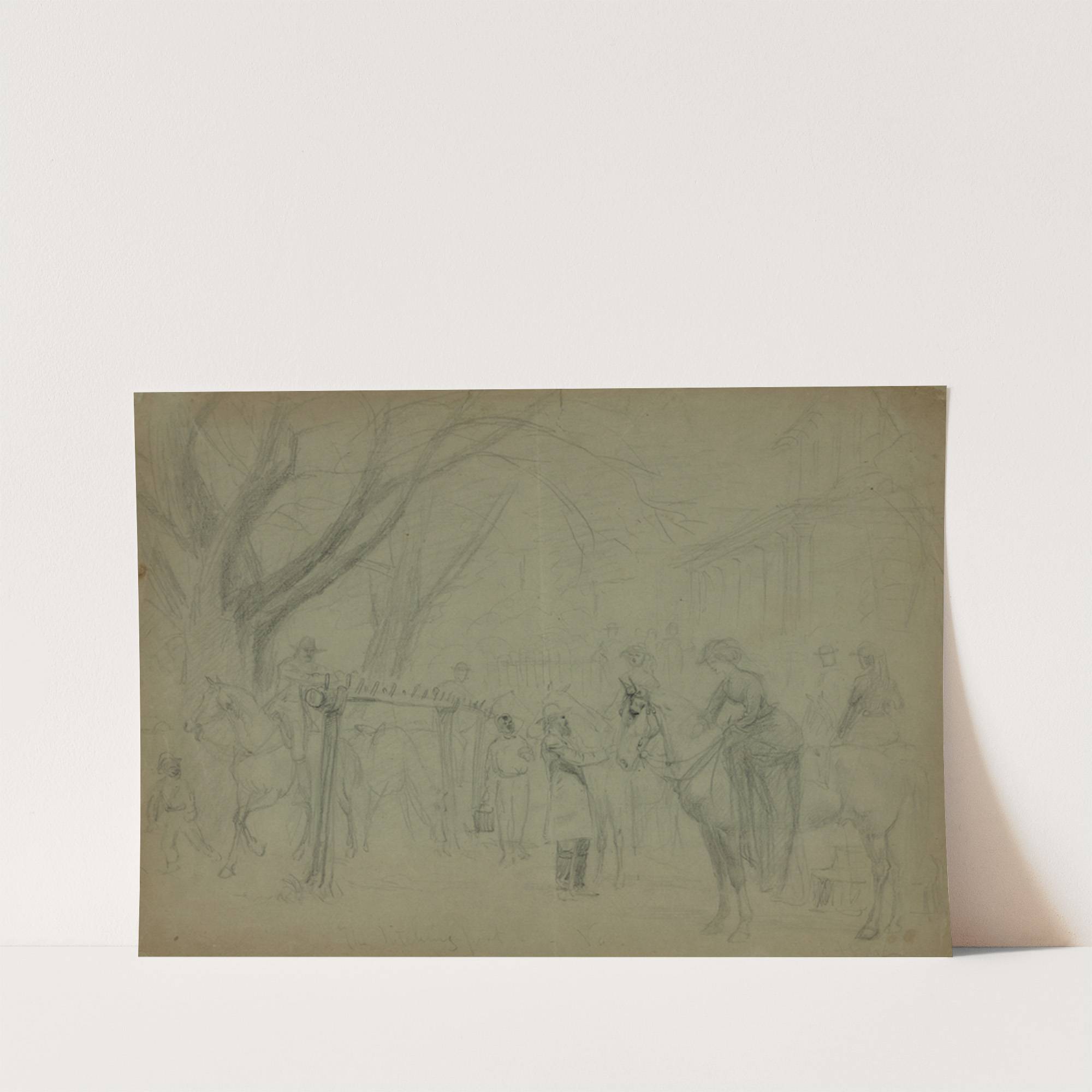 This artwork titled "The Hitching Post, Va." by Alfred Rudolph Waud is a delicate pencil sketch on aged paper, evoking a sense of rustic charm and historical nostalgia. The composition captures a small scene set in what appears to be...