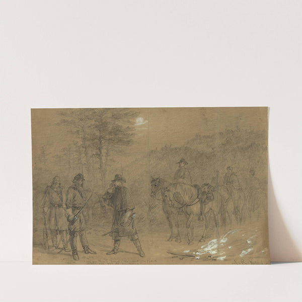 Experience the timeless artistry of Alfred Rudolph Waud with "The Picket Guard: 'Who goes there', 'Friends', Dismount one friend, Advance and Give the Countersign'". This finely detailed pencil drawing captures a moment in a rustic military scene. At the center,...