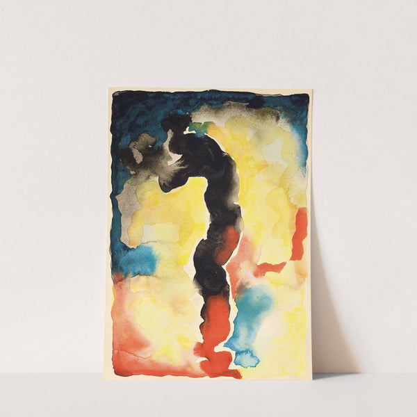 This vibrant abstract painting features a striking silhouette of a human figure rendered in bold black hues against a dynamic background. The figure is centrally positioned with an arched, almost playful stance, standing out due to the strong contrast against...