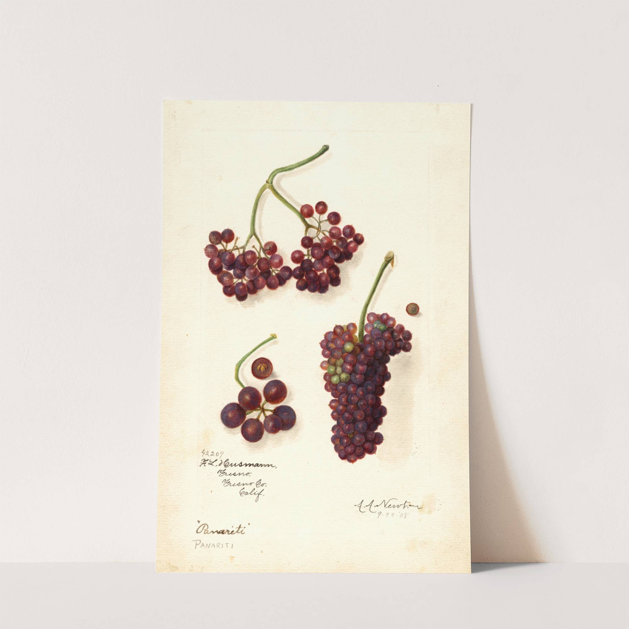 This stunning art print features a meticulously detailed botanical illustration of various types of currants by artist Amanda Almira Newton. The composition showcases five clusters of vibrant red and purple berries, each with its unique shape and color gradient. From...