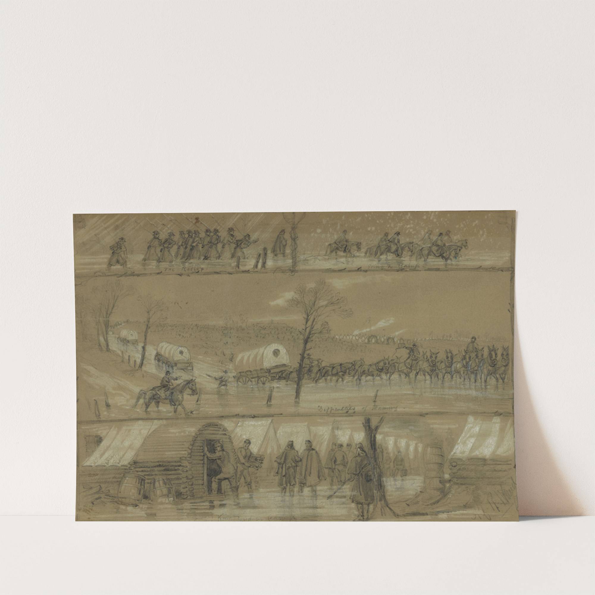 This art print features "Why the Army of the Potomac Doesn't Move" by Alfred Rudolph Waud. The artwork is rendered in sepia tones, giving it a nostalgic and historical feel. It depicts a series of scenes capturing the American Civil...