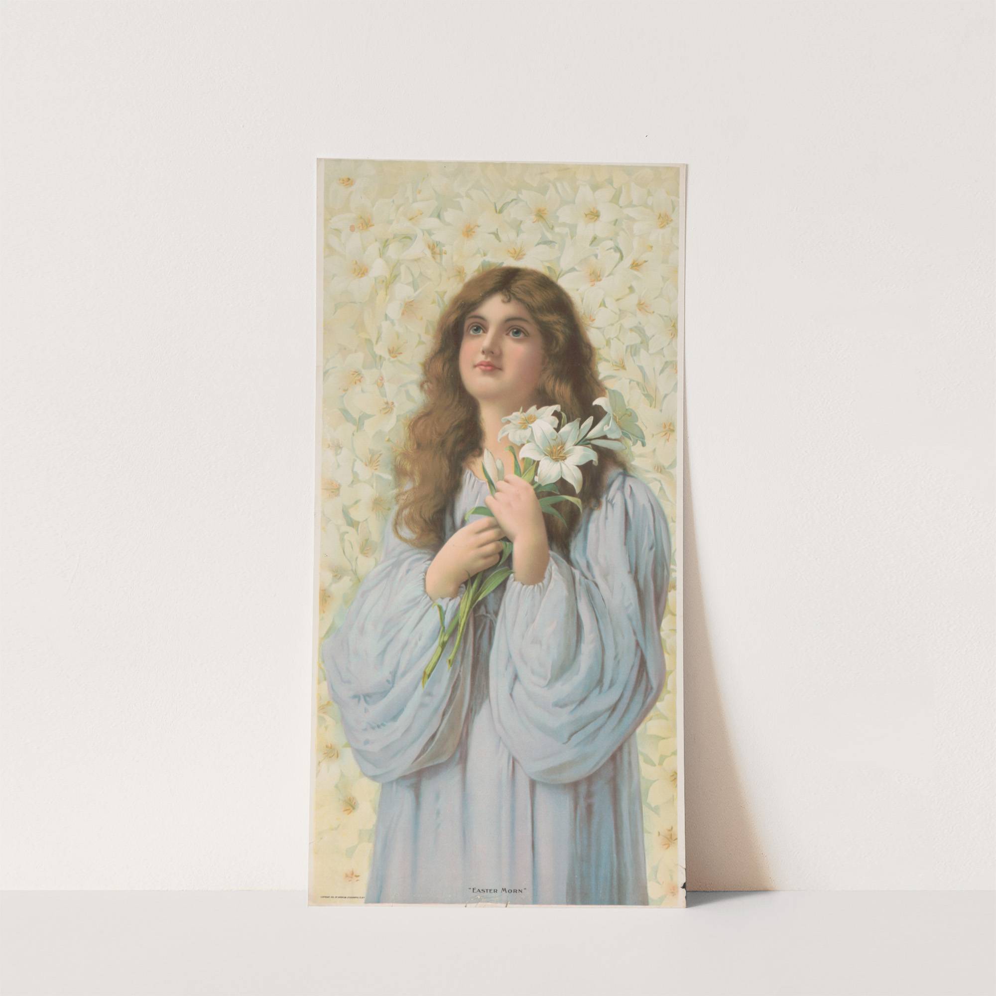 This beautifully detailed art print depicts "Easter Morn" by the American Lithograph Company, created in 1901. The image showcases a young woman with soft, flowing brown hair that cascades down her shoulders. She has a delicate, fair complexion and a...