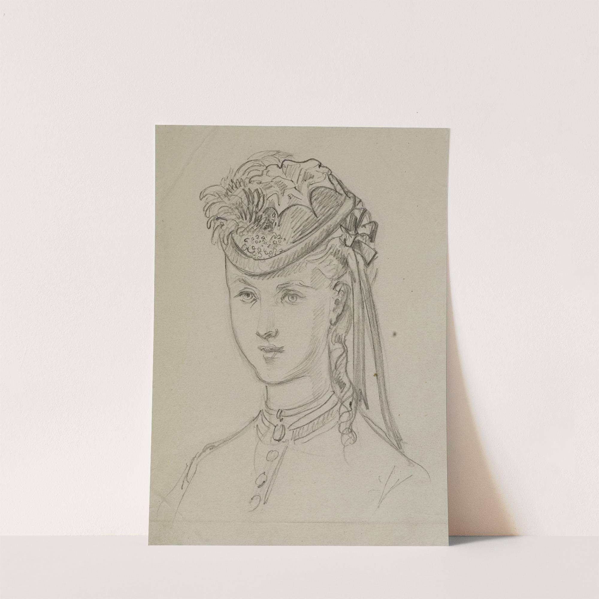 This elegant pencil drawing, titled "Tête féminine avec coiffe 2" by Anaïs Colin-Toudouze, features a beautifully detailed portrait of a young woman from the late 19th century. The artwork is rendered with fine, meticulous lines that bring out the delicate...