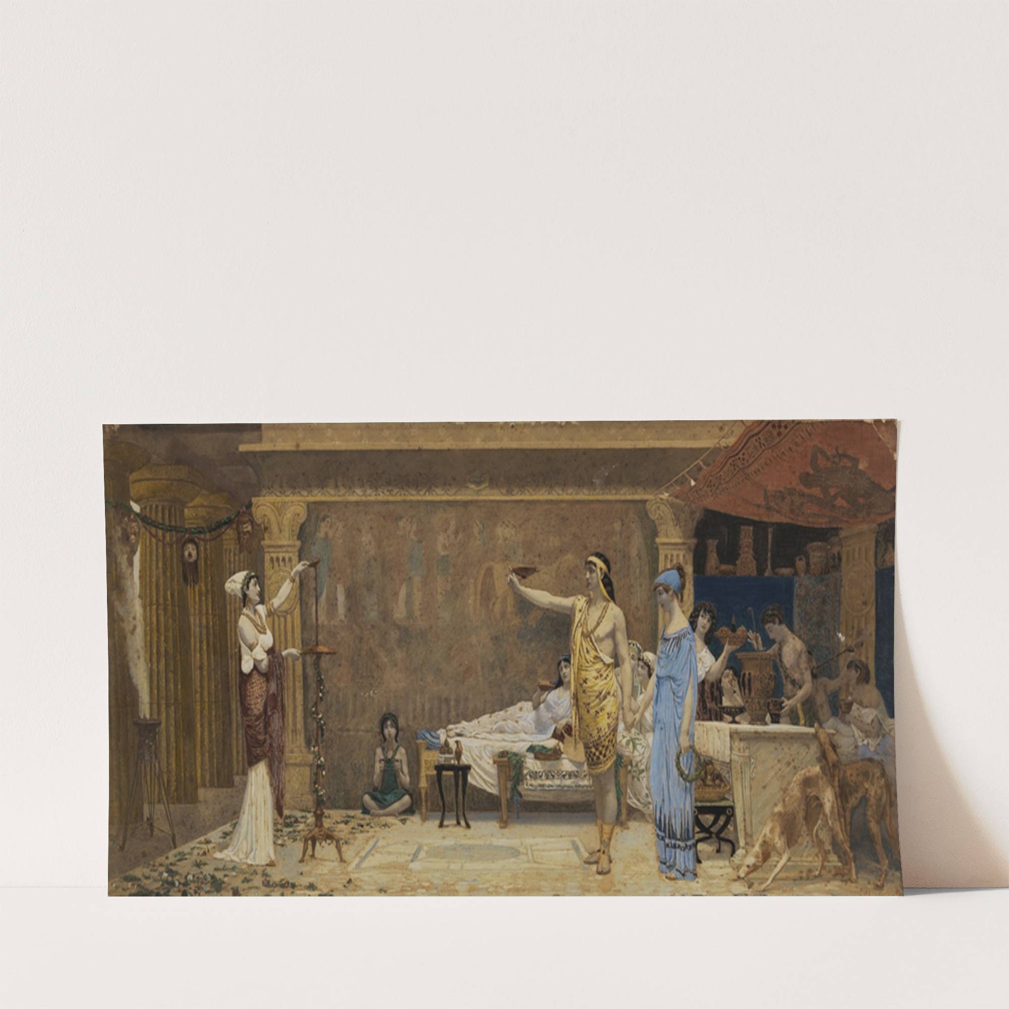 This artwork by Anatolio Scifoni, titled "Cottabo," portrays a richly detailed scene set in an ancient Mediterranean-style household. The painting features four women engaged in various activities within a warmly lit, rustic interior. On the left, a woman dressed in...