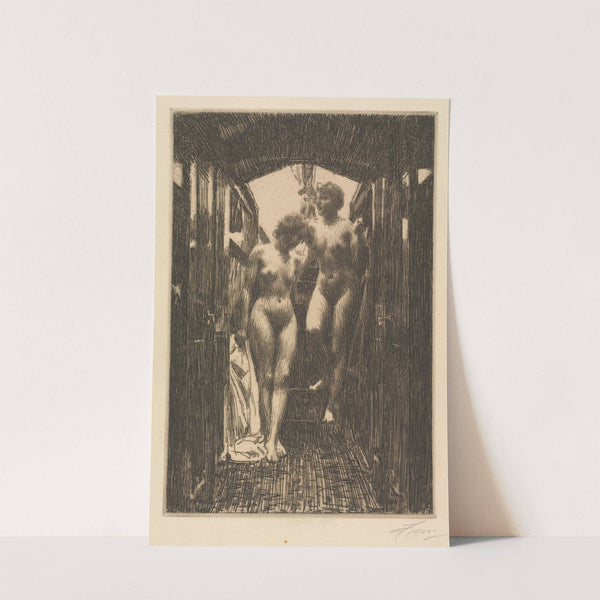 This art print features "Cabin" by Anders Zorn, executed in a detailed monochromatic style that captures the timeless elegance of classic realism. The scene depicts two nude women standing closely together in an archway entrance, their figures illuminated by soft...