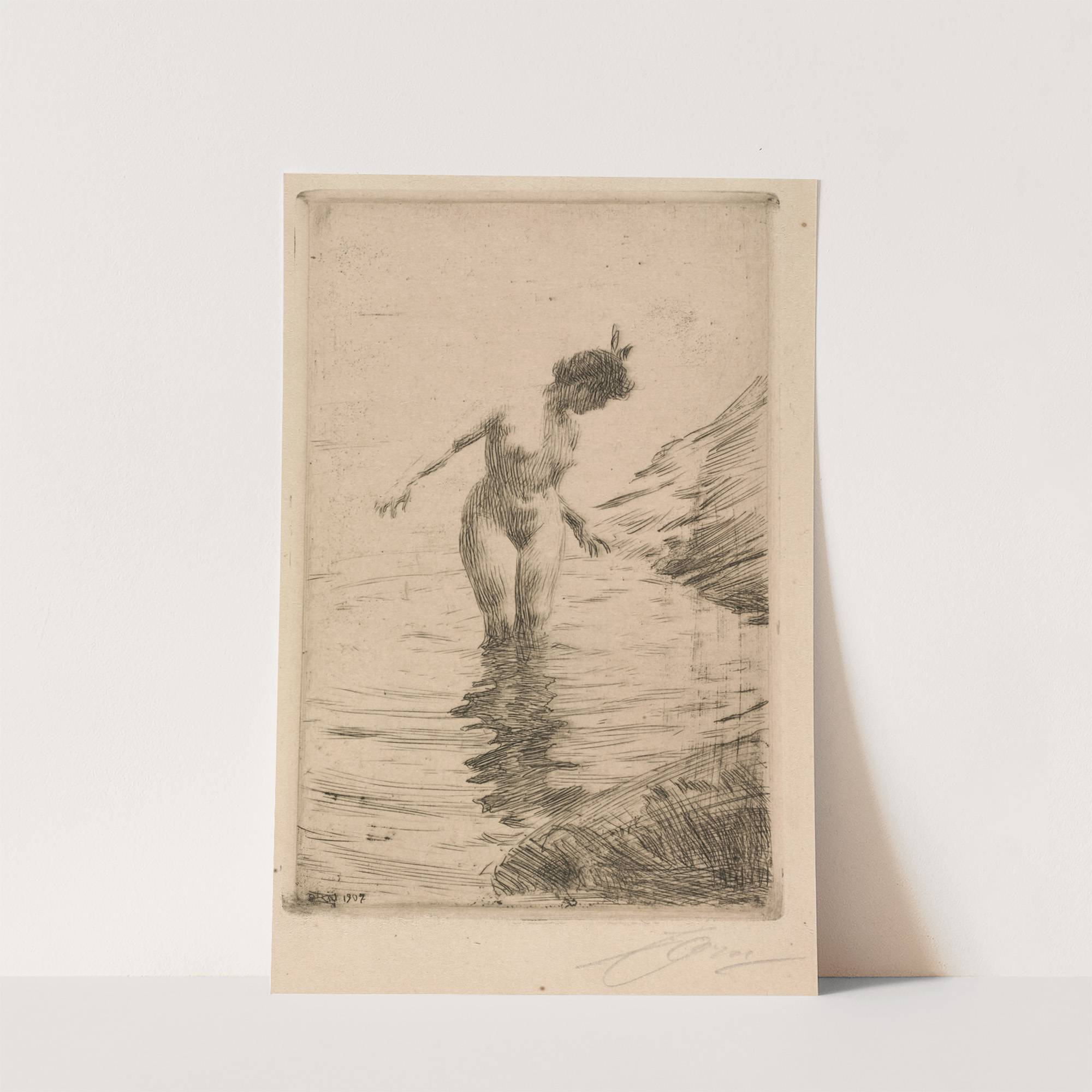 This is "Circles of Water II" by Anders Zorn, a captivating monochromatic drawing that exudes an ethereal quality. The artwork features a slender woman standing in shallow water, her reflection rippling gently on the surface. Her body is slightly hunched...