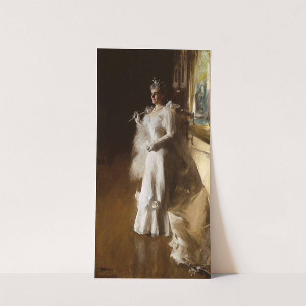 This stunning art print features "Mrs. Potter Palmer" by the renowned artist Anders Zorn, created in 1893. The painting showcases a regal woman standing gracefully in a dimly lit room that casts her in radiant white light, highlighting her elegant...