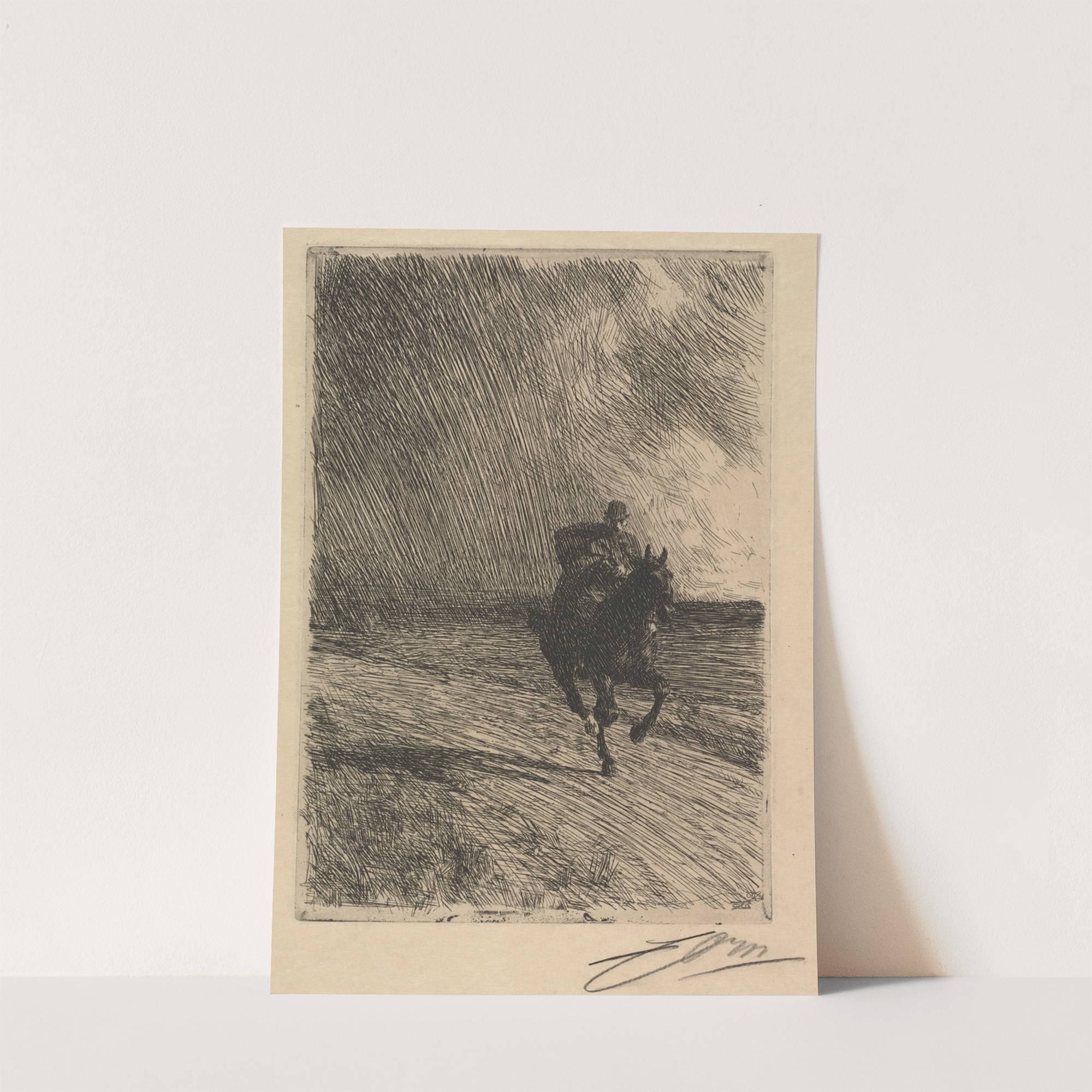 This exquisite art print is a striking monochromatic etching titled "Storm" by the renowned artist Anders Zorn. It beautifully captures the essence of a rugged stormy landscape with incredible detail and texture. The central figure, silhouetted against the turbulent backdrop,...